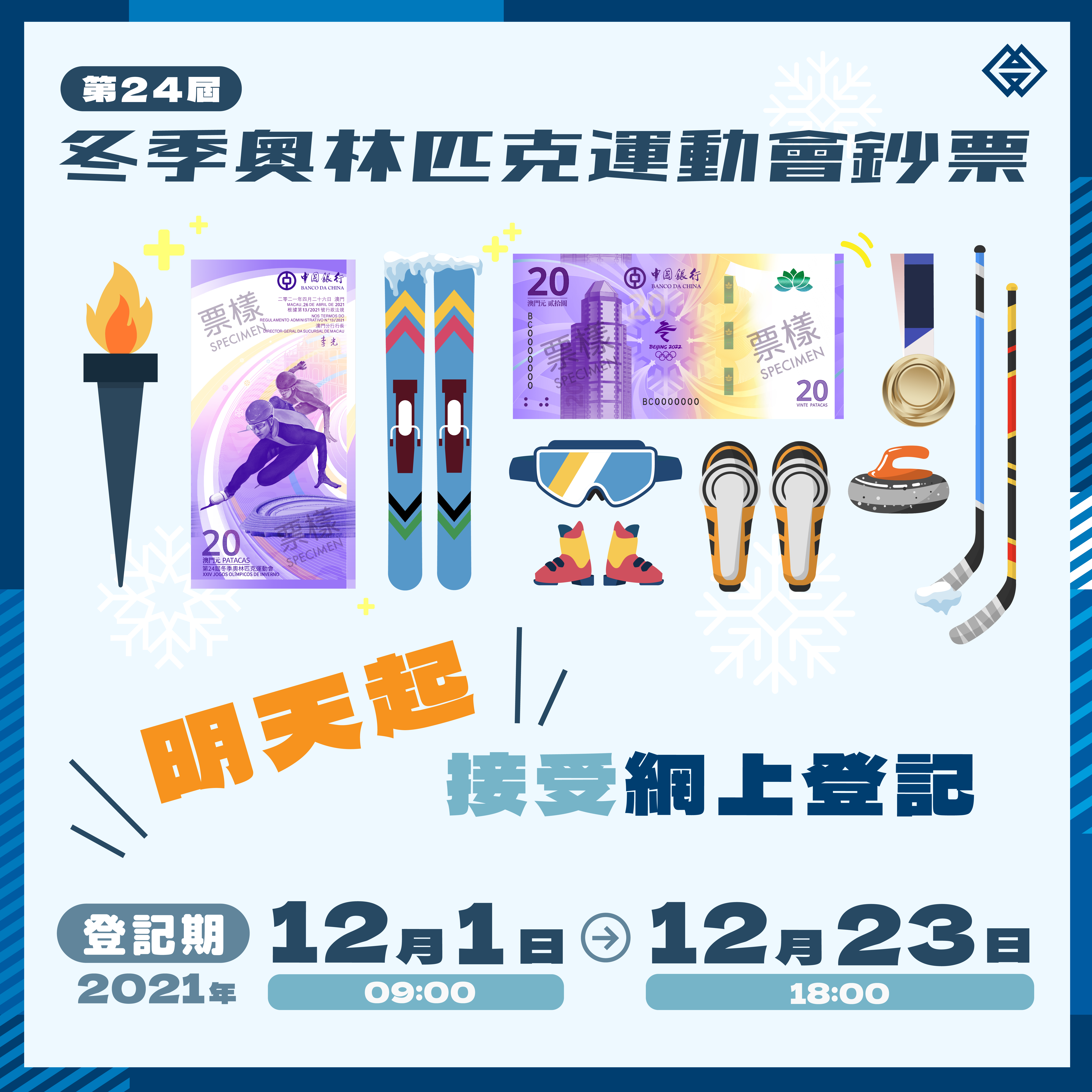 第24屆冬季奧林匹克運動會鈔票網上登記將於2021年12月1日(上午9時起)開始,澳門居民可透過澳門金融管理局的網頁進行兌換預約登記,每名澳門居民僅可登記一次及可兌換2張鈔票,登記期至2021年12月23日下午6時止。