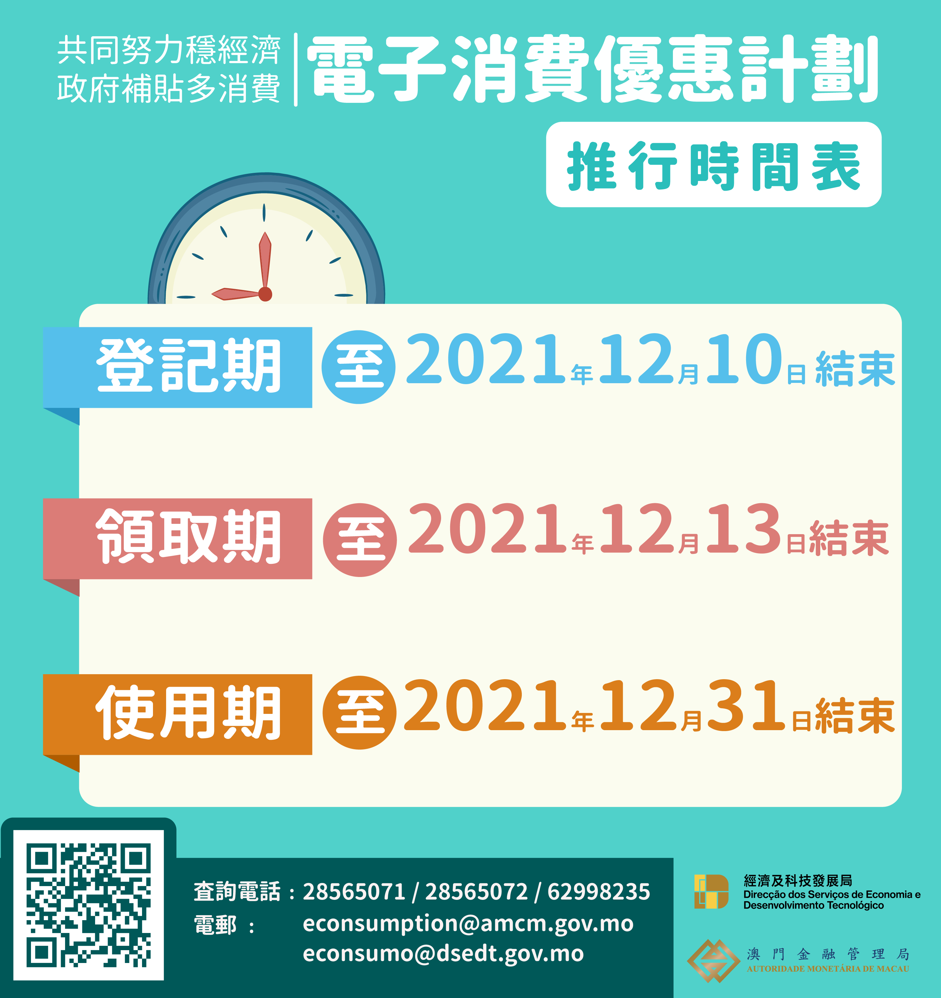 “電子消費優惠計劃”的最後登記日為12月10日,逾期將無法登記及領取電子消費優惠。呼籲尚未登記的澳門居民,請於登記期屆滿前辦理網上登記。