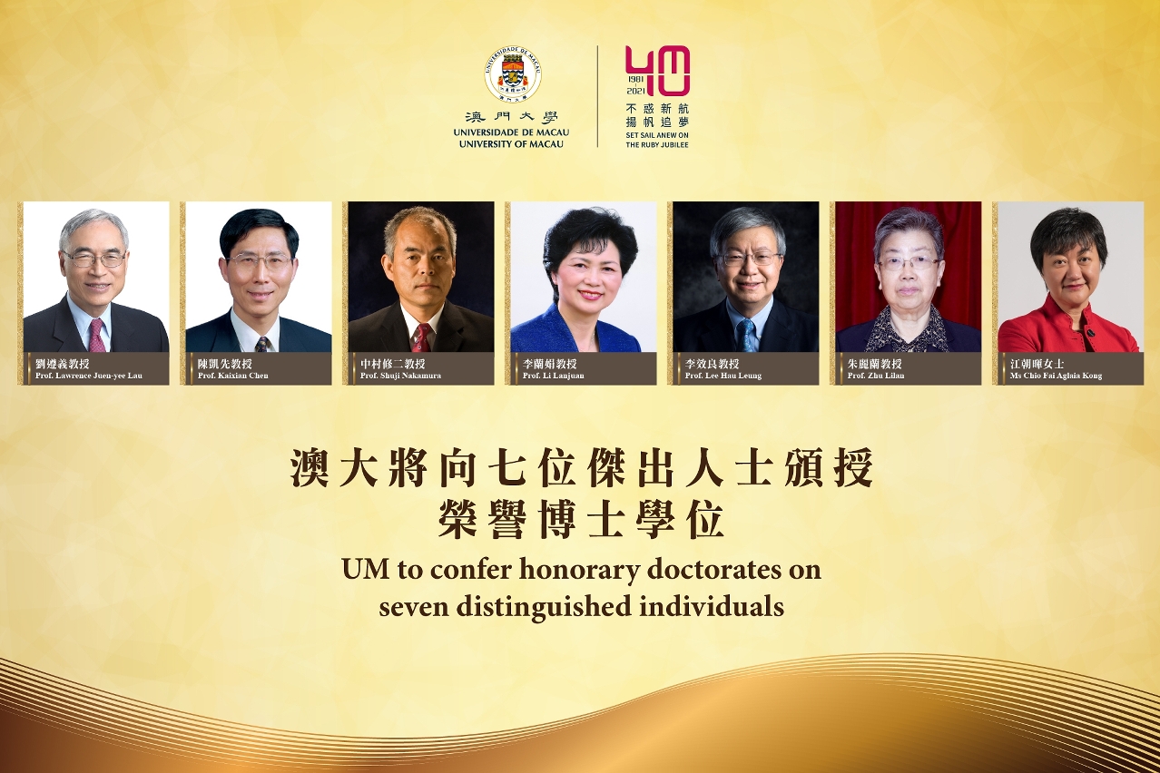 澳門大學將向劉遵義、陳凱先、中村修二、李蘭娟、李效良、朱麗蘭及江朝暉頒授澳大榮譽博士學位,以表彰其卓越成就、為社會和教育的發展所作出的重大貢獻。有關榮譽學位及高等學位頒授典禮將於12月11日(星期六)下午4時在澳大大學會堂舉行;此外,同場還會頒授博士、碩士學位和學士後課程證書/文憑。典禮設有現場直播,讓世界各地的畢業生和親友都能參與其中。