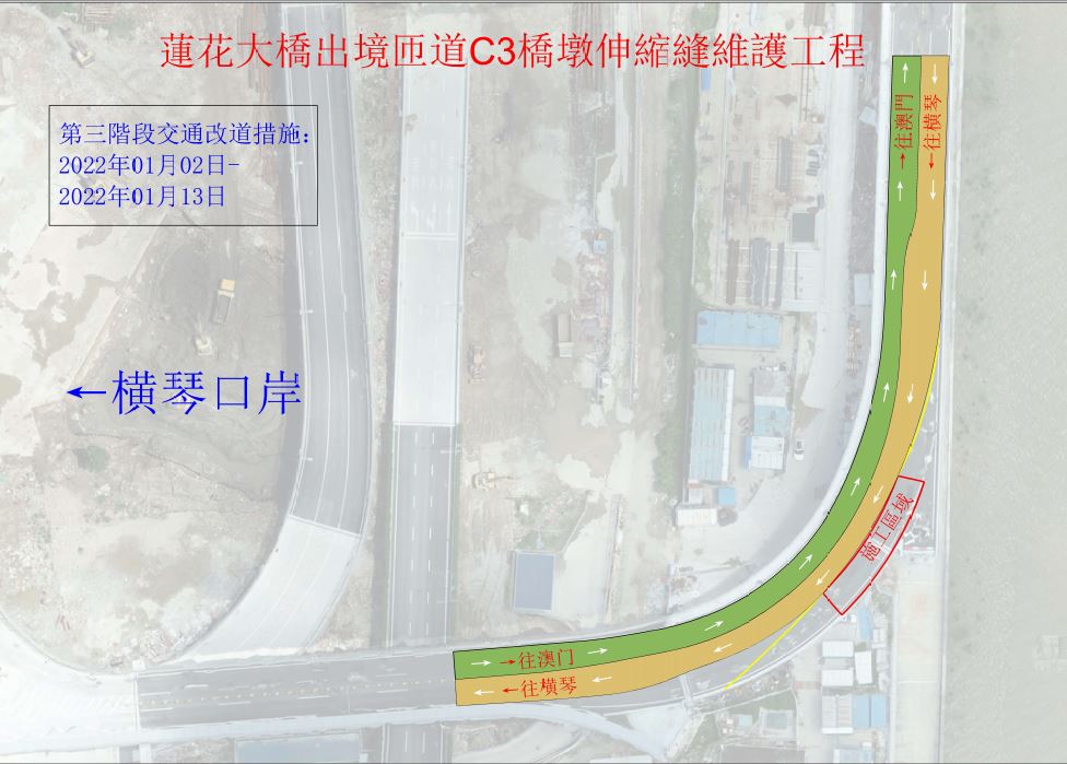 為配合蓮花大橋澳門出境匝道C3橋墩伸縮縫維護施工,出境匝道近C3橋墩的路段將分時段實施下列臨時交通措施: