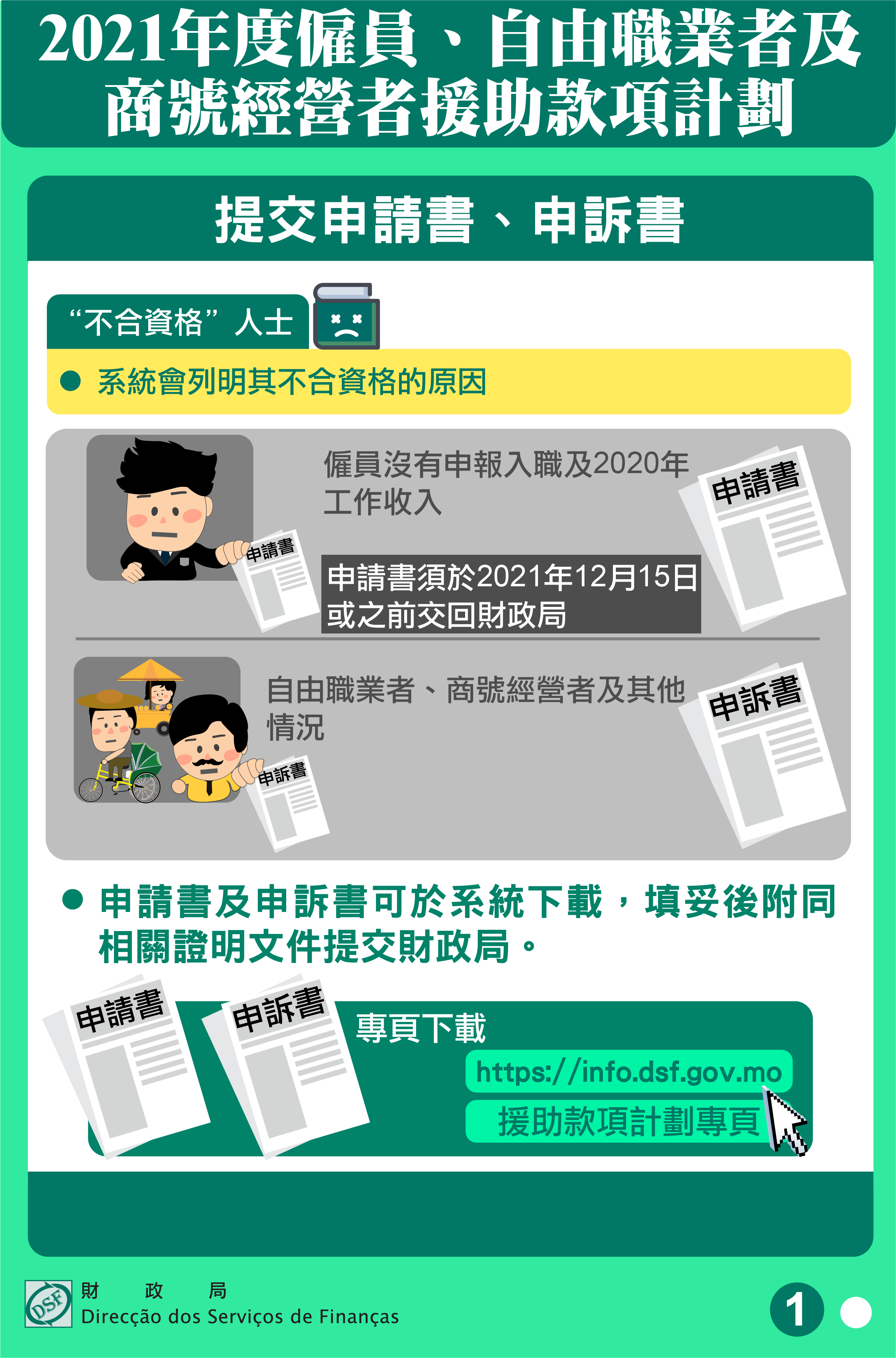 其他對發放結果有異議者,可於專頁( https://info.dsf.gov.mo )下載申訴書,填妥之後附同證明文件向財政局提交。
