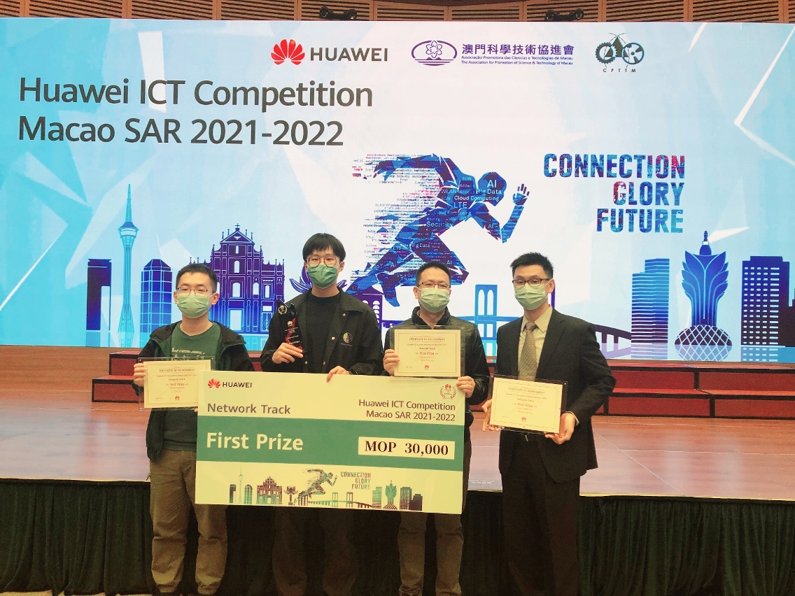 由華為澳門公司、科學技術協進會及生產力暨科技轉移中心合辦的“華為第六屆全球ICT大賽——澳門站”於12月11日舉行頒獎禮,澳門理工學院計算機應用技術博士學位課程溫宇強、大數據與物聯網碩士學位課程姚宇及電腦學學士學位課程張博亮所組成的學生隊伍勇奪網絡賽道一等奬,並代表澳門晉級亞太區域賽,將與亞太區的頂尖學生一較高下。同時,由計算機應用技術博士學位課程李宗妮、大數據與物聯網碩士學位課程呂明媚及電腦學學士學位課程沙俊所組成的學生隊伍在雲賽道亦獲得三等奬佳績。