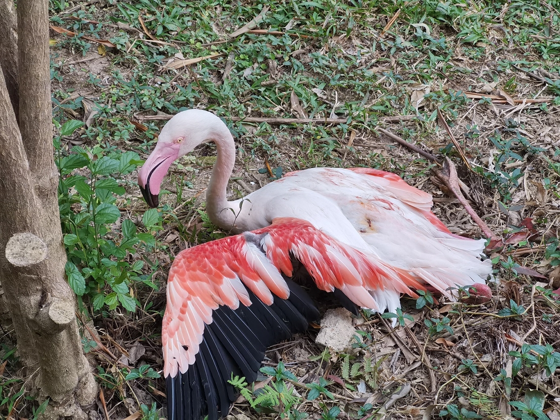 昨日早上約七時半,市政署保安人員恆常巡查石排灣郊野公園火烈鳥飼養區時,發現三隻流浪狗闖入飼養區並攻擊火烈鳥,保安人員即驅趕,三隻流浪狗逃去無蹤,飼養人員聞訊趕到現場,發現七隻火烈鳥被攻擊受傷,其中五隻即場死亡,另外兩隻的背及翼部被咬,深及骨骼,傷勢嚴重,經獸醫搶救,一隻延至今日早上不治,另一隻目前情況仍然危殆,飼養區內其餘十一隻火烈鳥則沒有受傷。