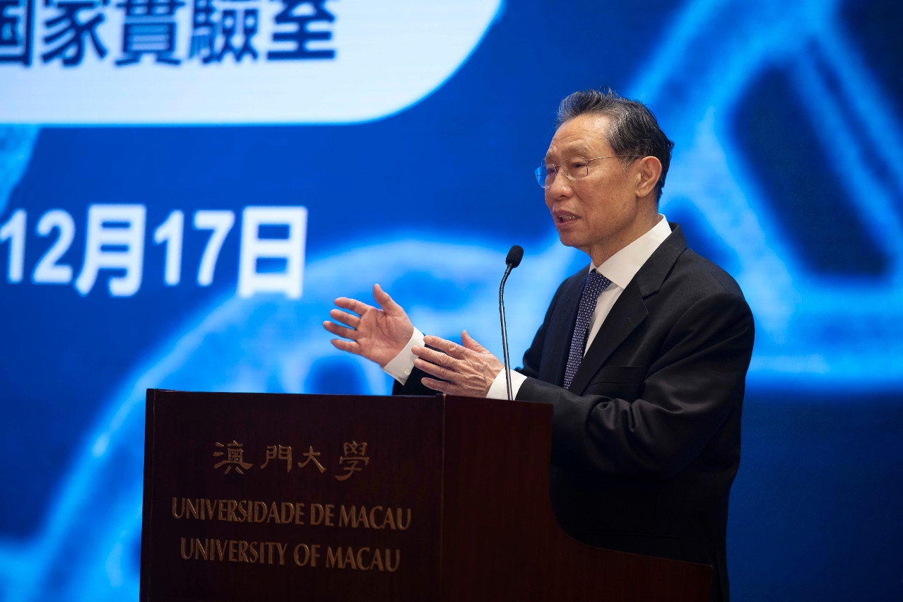 儀式上,澳門特別行政區行政長官賀一誠、中央人民政府駐澳門特別行政區聯絡辦公室主任傅自應、鍾南山和澳門大學校董會主席林金城共同為研究院揭牌。澳門特區政府經濟財政司司長李偉農、鍾南山和澳門大學校長宋永華分別致辭。