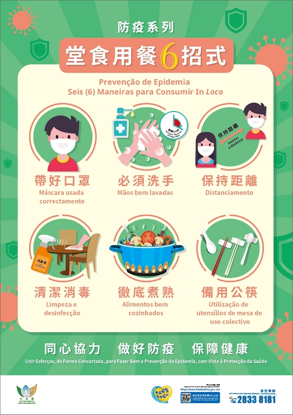 為了增加市民及業界對食品安全措施的認知,市政署於食品安全資訊網 www.foodsafety.gov.mo 設有“外賣訂餐要注意”專頁,提供相關食安指引、指南,以及圖文包、教育短片等宣教內容。同時,因應市民秋冬飲食習慣,亦設立“秋冬季節食品安全”專頁,提供具季節性的食安提示,歡迎市民及業界瀏覽。