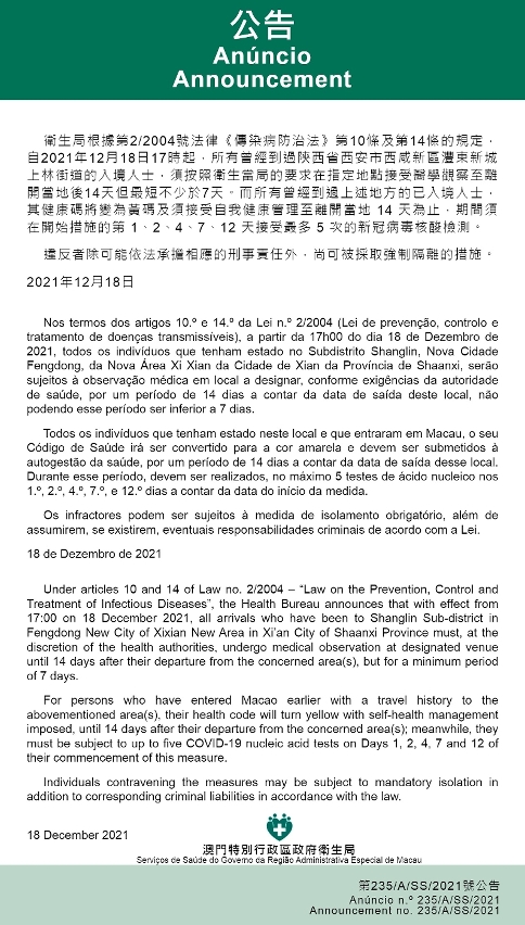 新型冠狀病毒感染應變協調中心(下稱“應變協調中心”)宣佈,因應陝西省的疫情變化,自2021年12月18日下午5時起,所有曾經到過陝西省西安市西咸新區灃東新城上林街道的入境人士,須按照衛生當局的要求在指定地點接受醫學觀察至離開當地後14天但最短不少於7天。而所有曾經到過上述地方的已入境人士,其健康碼將變為黃碼及須接受自我健康管理至離開當地 14 天為止,期間須在開始措施的第1、2、4、7、12 天接受最多 5 次的新冠病毒核酸檢測。免費核酸檢測預約連結為https://app.ssm.gov.mo/mandatoryrnatestbook。核酸檢測結果不會上載至澳門健康碼亦不可作為出入境用途。如需將核酸檢測結果在澳門健康碼顯示,則須自費檢測。