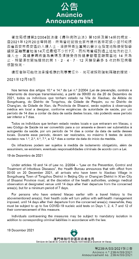 新型冠狀病毒感染應變協調中心(下稱“應變協調中心”)宣佈,因應北京市和陝西省的疫情變化,自2021年12月20日零時起,所有曾經到過北京市通州區宋莊鎮小堡村或陝西省西安市長安區的入境人士,須按照衛生當局的要求在指定地點接受醫學觀察至離開當地後14天但最短不少於7天。而所有曾經到過上述地方的已入境人士,其健康碼將變為黃碼及須接受自我健康管理至離開當地 14 天為止,期間須在開始措施的第 1、2、4、7、12 天接受最多 5 次的新冠病毒核酸檢測。免費核酸檢測預約連結為https://app.ssm.gov.mo/mandatoryrnatestbook。核酸檢測結果不會上載至澳門健康碼亦不可作為出入境用途。如需將核酸檢測結果在澳門健康碼顯示,則須自費檢測。