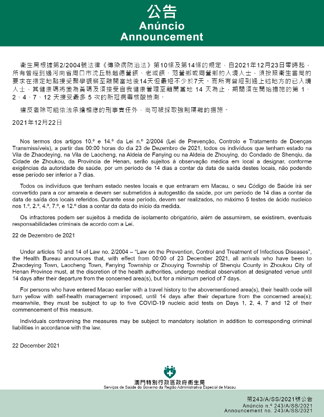 新型冠狀病毒感染應變協調中心(下稱“應變協調中心”)宣佈,因應河南省的疫情變化,自2021年12月23日零時起,所有曾經到過河南省周口市沈丘縣趙德營鎮、老城鎮、范營鄉或周營鄉的入境人士,須按照衛生當局的要求在指定地點接受醫學觀察至離開當地後14天但最短不少於7天。而所有曾經到過上述地方的已入境人士,其健康碼將變為黃碼及須接受自我健康管理至離開當地 14 天為止,期間須在開始措施的第 1、2、4、7、12 天接受最多 5 次的新冠病毒核酸檢測。免費核酸檢測預約連結為https://app.ssm.gov.mo/mandatoryrnatestbook。核酸檢測結果不會上載至澳門健康碼亦不可作為出入境用途。如需將核酸檢測結果在澳門健康碼顯示,則須自費檢測。