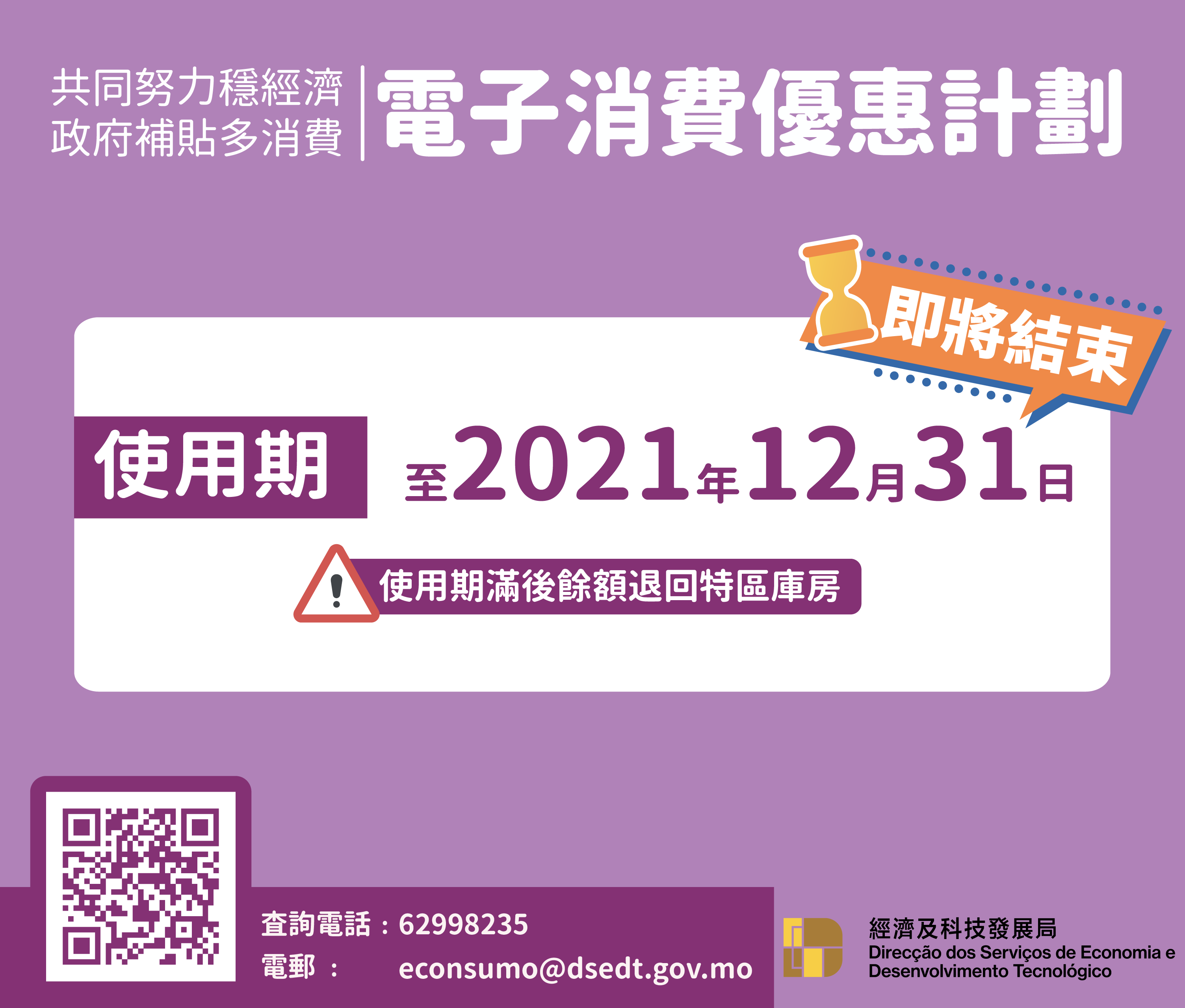 如對“電子消費優惠計劃”有疑問,可瀏覽專題網頁(www.dsedt.gov.mo/econsumo),亦歡迎在辦公時間,按下列途徑向經科局查詢: