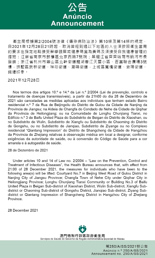 新型冠狀病毒感染應變協調中心(下稱“應變協調中心”)宣佈,因應內地的疫情變化,自2021年12月28日晚上9時起,取消曾經到過以下地區的人士須按照衛生當局的要求在指定地點接受醫學觀察或健康碼變為黃碼及須接受自我健康管理的措施:江蘇省南京市鼓樓區北京西路7號院;黑龍江省齊齊哈爾市訥河市長發鎮;浙江省杭州市蕭山區北幹街道龍湖春江天璽小區、百富聯合廣場3號樓,拱墅區武林街道、祥符街道、潮鳴街道,上城區筧橋街道、紫陽街道、錢塘印象。