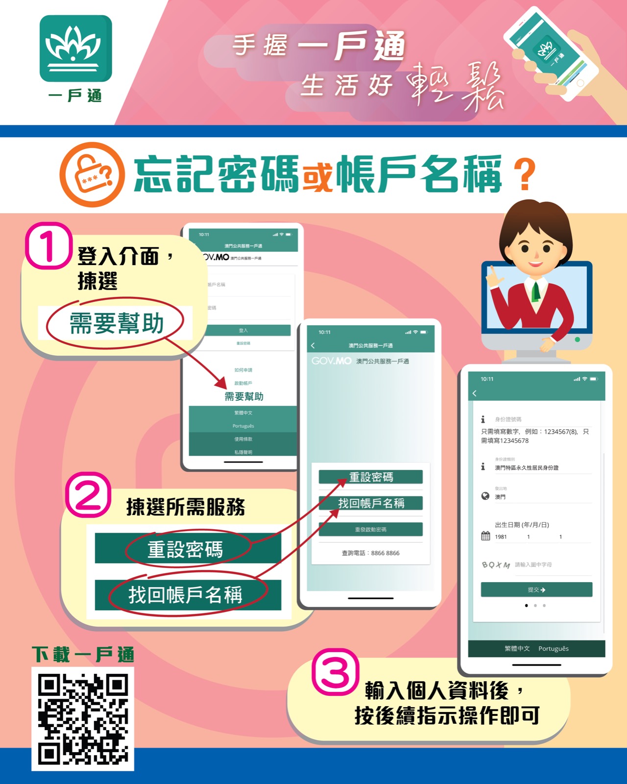 當局日前已舉辦8場介紹會,向各社服機構前線人員,以及澳門工會聯合總會、澳門街坊會聯合總會、澳門婦女聯合總會、澳門歸僑總會、民眾建澳聯盟、澳門江門同鄉會等社團人員進行講解和培訓。如市民在開戶、重設密碼或辦理時遇到困難,可前往上述社團和超過100間社服設施尋求指導和幫助,詳情請瀏覽https://www.ias.gov.mo/wp-content/uploads/file/social_service_facility_list.pdf。