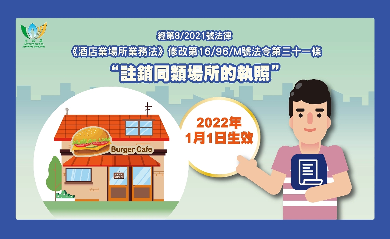 自2022年1月1日起,第8/2021號法律《酒店業場所業務法》正式生效,法律訂明註銷同類場所牌照的情況。市政署提醒各飲食及飲料場所持牌人須留意新法的相關規定,按牌照所示之應續期期間,主動向市政署提起續期申請,否則牌照可被註銷。