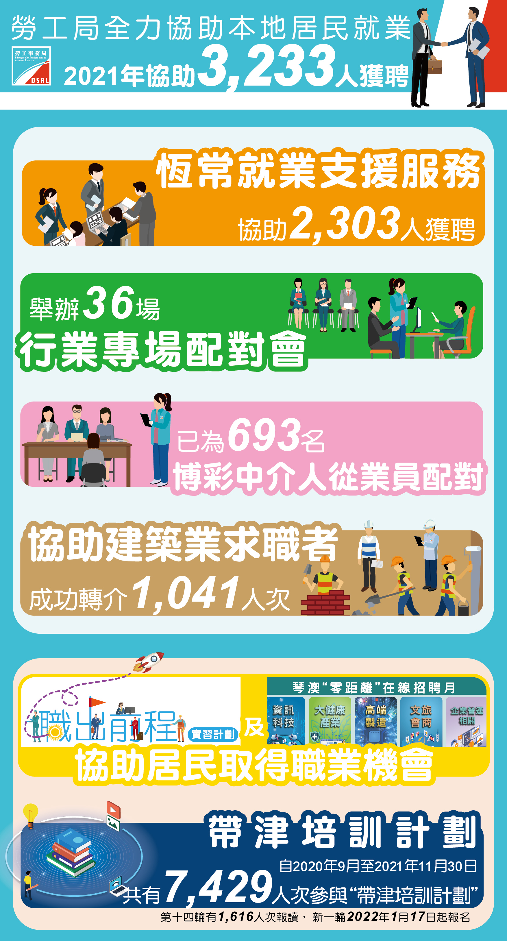 勞工事務局持續關注就業市場的變化,協助本地居民就業,持續透過提供各項適切的支援服務,從不同層面全力協助求職者盡快投入職場。