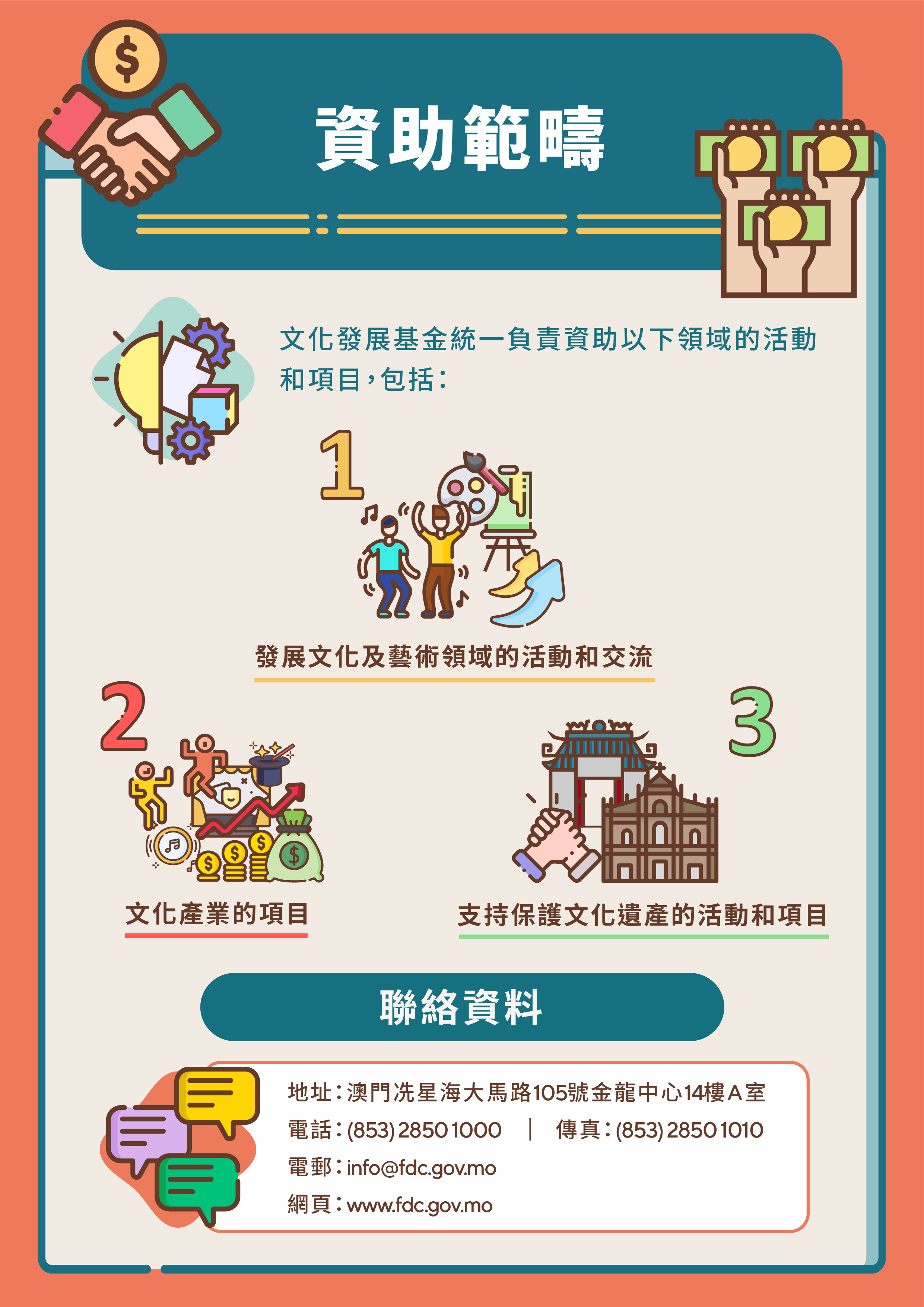 文化發展基金於2022年1月1日起運作,為配合基金的設立,已開通官方網站www.fdc.gov.mo及電郵地址域名fdc.gov.mo。