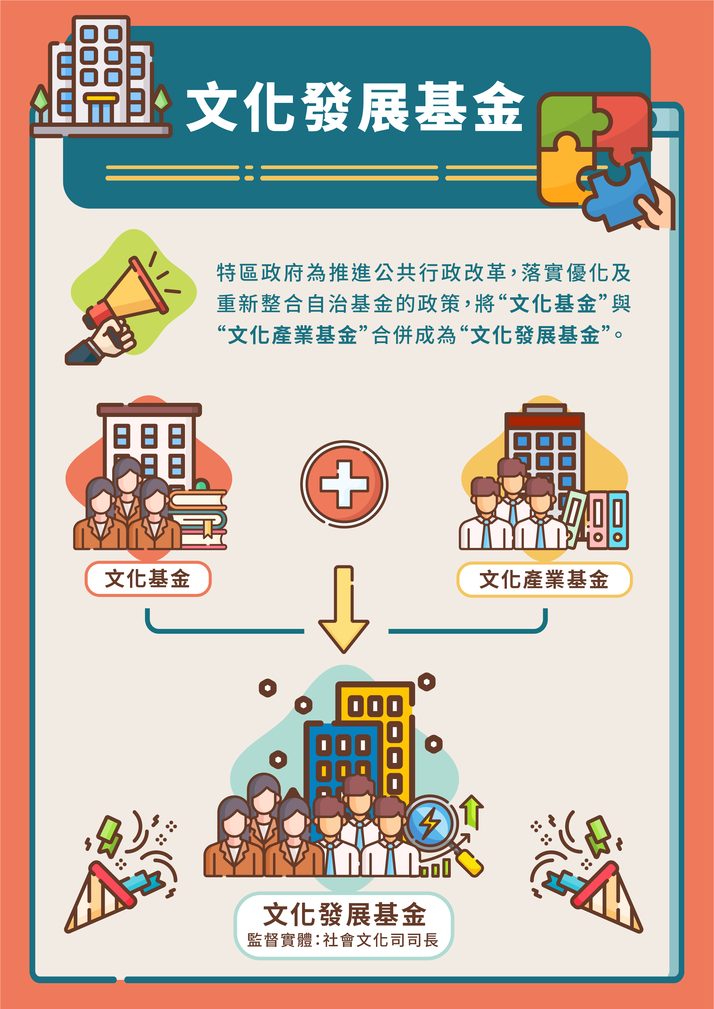 為推進公共行政改革,落實優化及重新整合自治基金的政策,特區政府將文化局的文化基金與文化產業基金合併為新的“文化發展基金”,葡文名稱為“Fundo de Desenvolvimento da Cultura”。相關的行政法規於2022年1月1日生效。