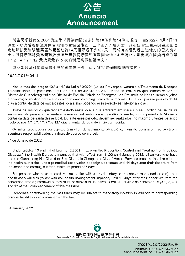 新型冠狀病毒感染應變協調中心(下稱“應變協調中心”)宣佈,因應河南省的疫情變化,自2022年1月4日上午11時起,所有曾經到過河南省鄭州市管城回族區、二七區的入境人士,須按照衛生當局的要求在指定地點接受醫學觀察至離開當地後14天但最短不少於7天。而所有曾經到過上述地方的已入境人士,其健康碼將變為黃碼及須接受自我健康管理至離開當地 14 天為止,期間須在開始措施的第 1、2、4、7、12 天接受最多 5 次的新冠病毒核酸檢測。免費核酸檢測預約連結為 https://app.ssm.gov.mo/mandatoryrnatestbook 。核酸檢測結果不會上載至澳門健康碼亦不可作為出入境用途。如需將核酸檢測結果在澳門健康碼顯示,則須自費檢測。