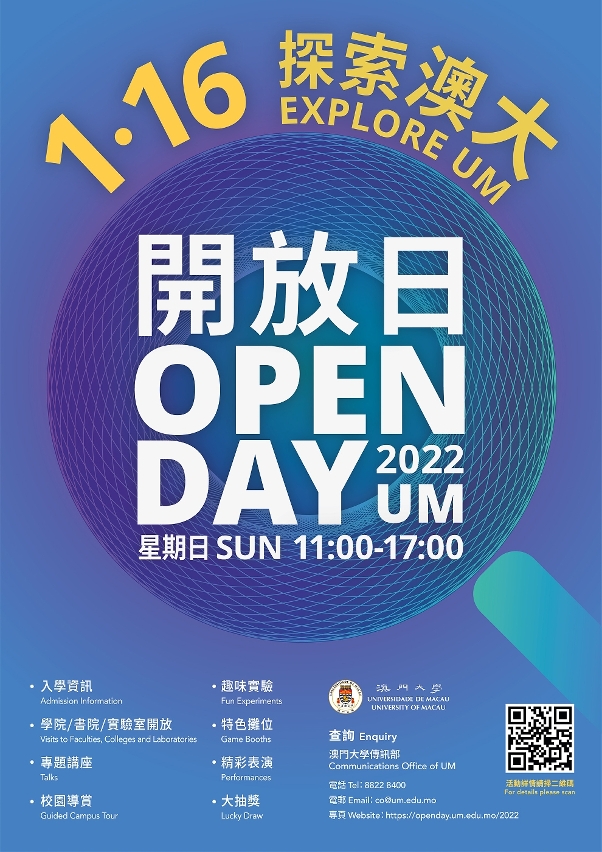 開放日開幕式將於當日上午11時在澳大聚賢樓(N1)多功能廳舉行;開放日則由上午11時至下午5時在澳大校園舉行,各教學設施將開放探索。各間學院、書院、實驗室、圖書館、體育館等均有專人在場,詳細介紹其特色和設施;同時設多個諮詢展位,全方位呈現各學系的課程內容,有意到澳大升學的學生可按個人興趣到心儀的學系,了解更多課程的特色。歡迎有興趣的學生和家長到場了解更多入學資訊,為參加“澳門大學入學考試"及“澳門四高校聯合入學考試"(1月5日起接受報名)做好準備。
