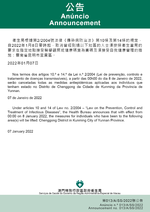 新型冠狀病毒感染應變協調中心(下稱“應變協調中心”)宣佈,因應河南省和廣東省的疫情變化,自2022年1月7日晚上9時起,所有曾經到過河南省鄭州市;廣東省深圳市龍崗區布吉街道的入境人士,須按照衛生當局的要求在指定地點接受醫學觀察至離開當地後14天但最短不少於7天。而所有曾經到過上述地方的已入境人士,其健康碼將變為黃碼及須接受自我健康管理至離開當地 14 天為止,期間須在開始措施的第1、2、4、7、12 天接受最多 5 次的新冠病毒核酸檢測。免費核酸檢測預約連結為https://app.ssm.gov.mo/mandatoryrnatestbook。核酸檢測結果不會上載至澳門健康碼亦不可作為出入境用途。如需將核酸檢測結果在澳門健康碼顯示,則須自費檢測。