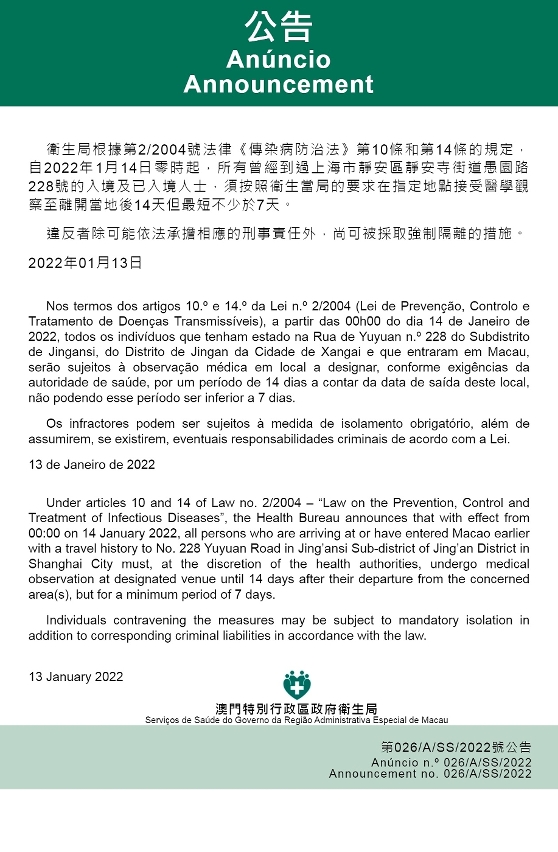 新型冠狀病毒感染應變協調中心(下稱“應變協調中心”)宣佈,因應上海市的疫情變化,衛生局根據第2/2004號法律《傳染病防治法》第10條和第14條的規定,自2022年1月14日零時起,所有曾經到過上海市靜安區靜安寺街道愚園路228號的入境及已入境人士,須按照衛生當局的要求在指定地點接受醫學觀察至離開當地後14天但最短不少於7天。