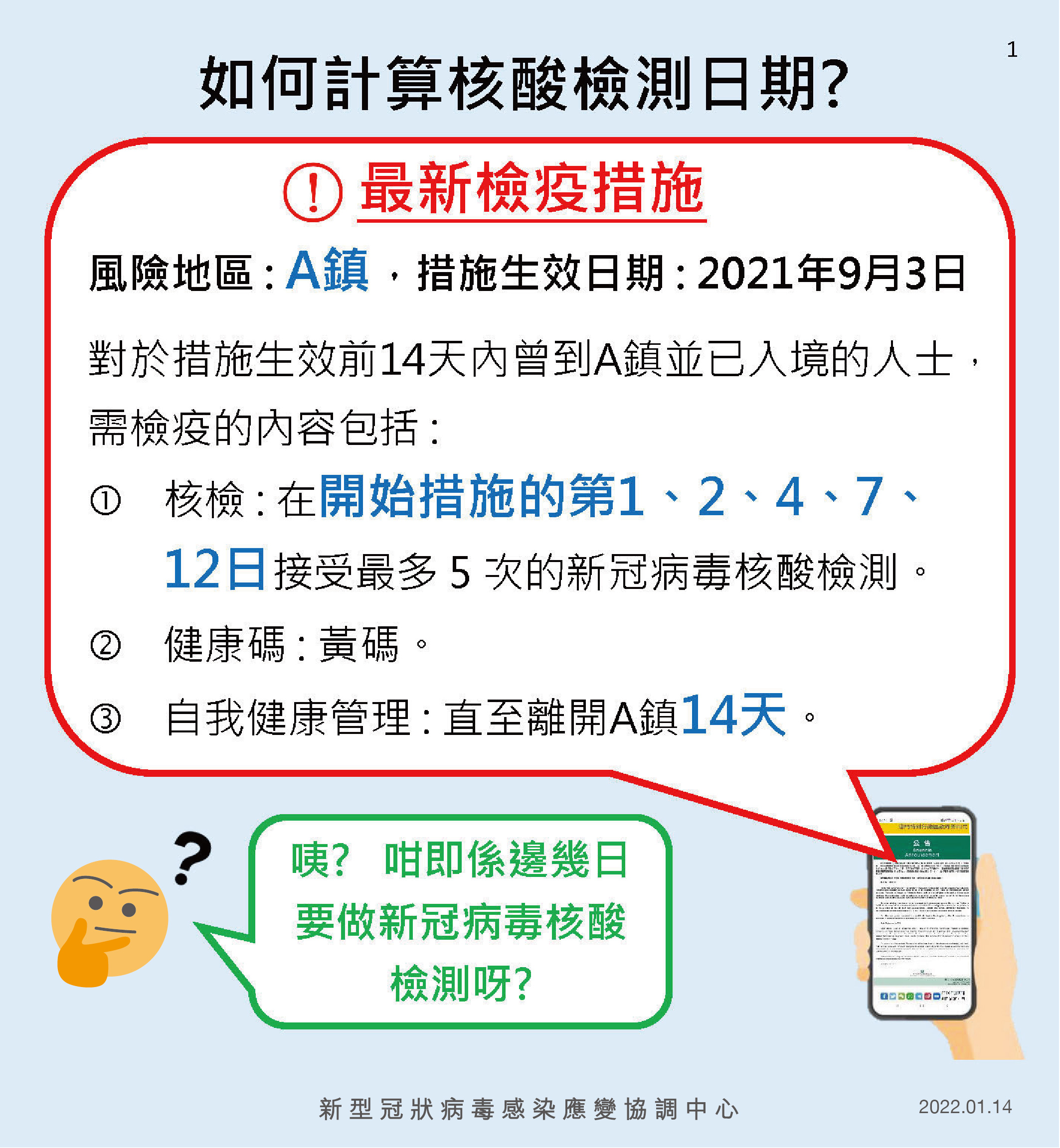 新型冠狀病毒感染應變協調中心(下稱「應變協調中心」)表示,因應廣東省的疫情變化,自2022年1月14日6時起,所有過去14天曾經到過廣東省珠海市香洲區南屏鎮的入境人士,須按照衛生當局的要求,在指定地點接受醫學觀察至離開當地後14天,但最短不少於7天。而所有曾經到過上述地方的已入境人士,其健康碼將變為黃碼及須接受自我健康管理至離開當地 14 天為止,期間須在開始措施的第1、2、4、7、12 天接受最多 5 次的新冠病毒核酸檢測。