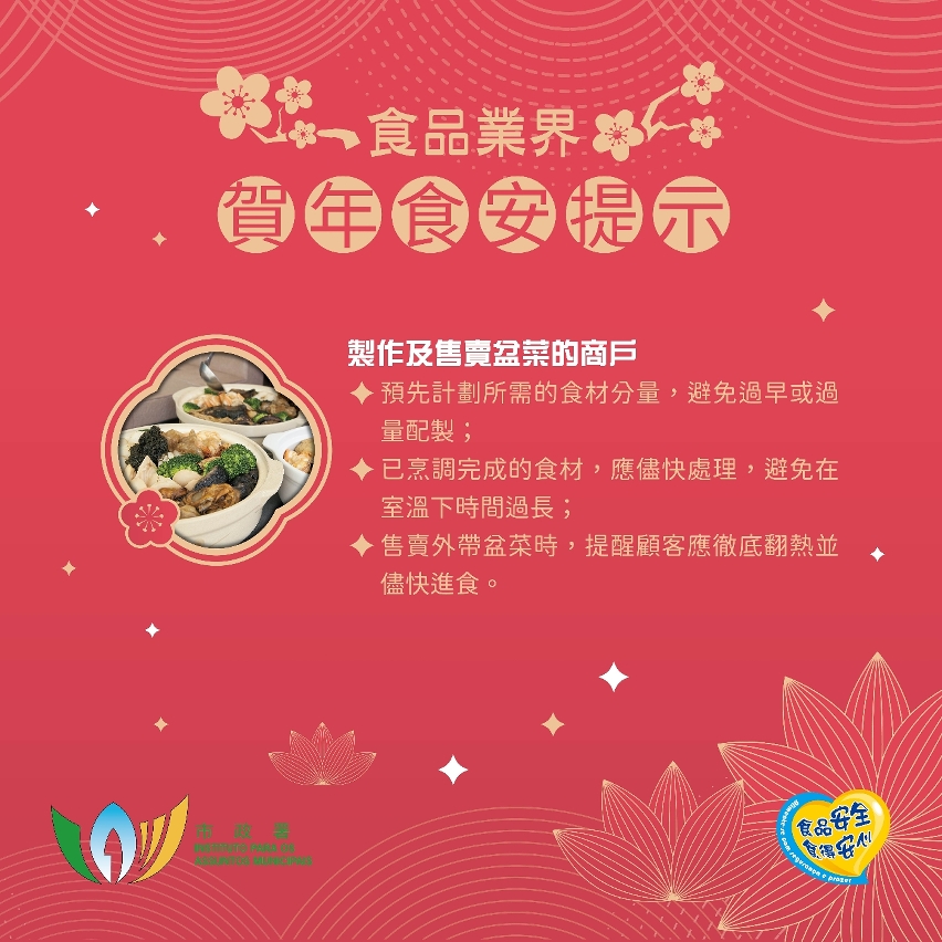 此外,一些賀年菜餚如盆菜,由於食材多樣且多為預先製作備用,製作及貯存時間較長,工序上稍有疏忽便會存在較高的食安風險。為此,市政署特別編製“安心享用盆菜”宣導小冊子,列出製作盆菜時須遵守的食安要點及衛生操作,例如在貯存食物時,應遵守“生熟分開”原則、切勿過量囤積備用食材等,輔導業界做好相關工作。
