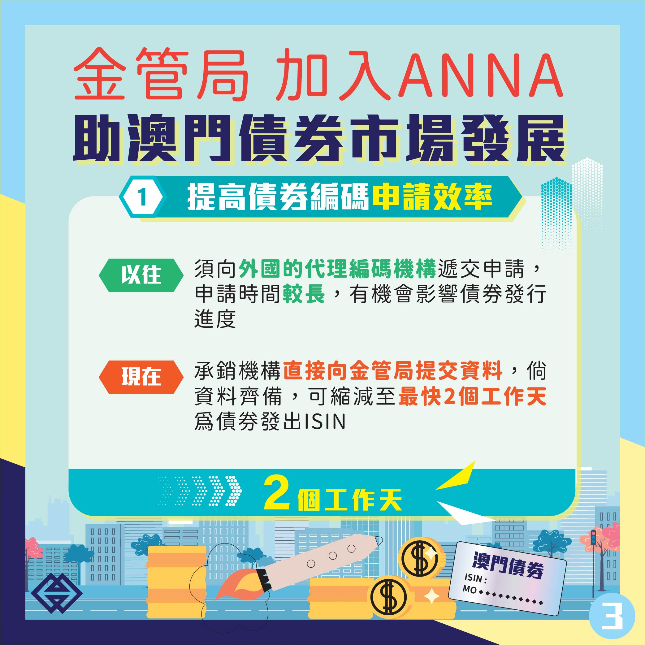 以往在澳門發行的債券的ISIN,由外國的代理編碼機構編配,受時差及資訊溝通影響,需時較長。為便利債券發行,金管局於去年申請加入ANNA,並構建相關的債券編碼系統。現時,金管局作為澳門編碼機構,已成功加入ANNA,並為在澳門發行的債券編配ISIN。倘申請ISIN的資料齊備,最快可於2個工作天內發出ISIN,大大提升效率。