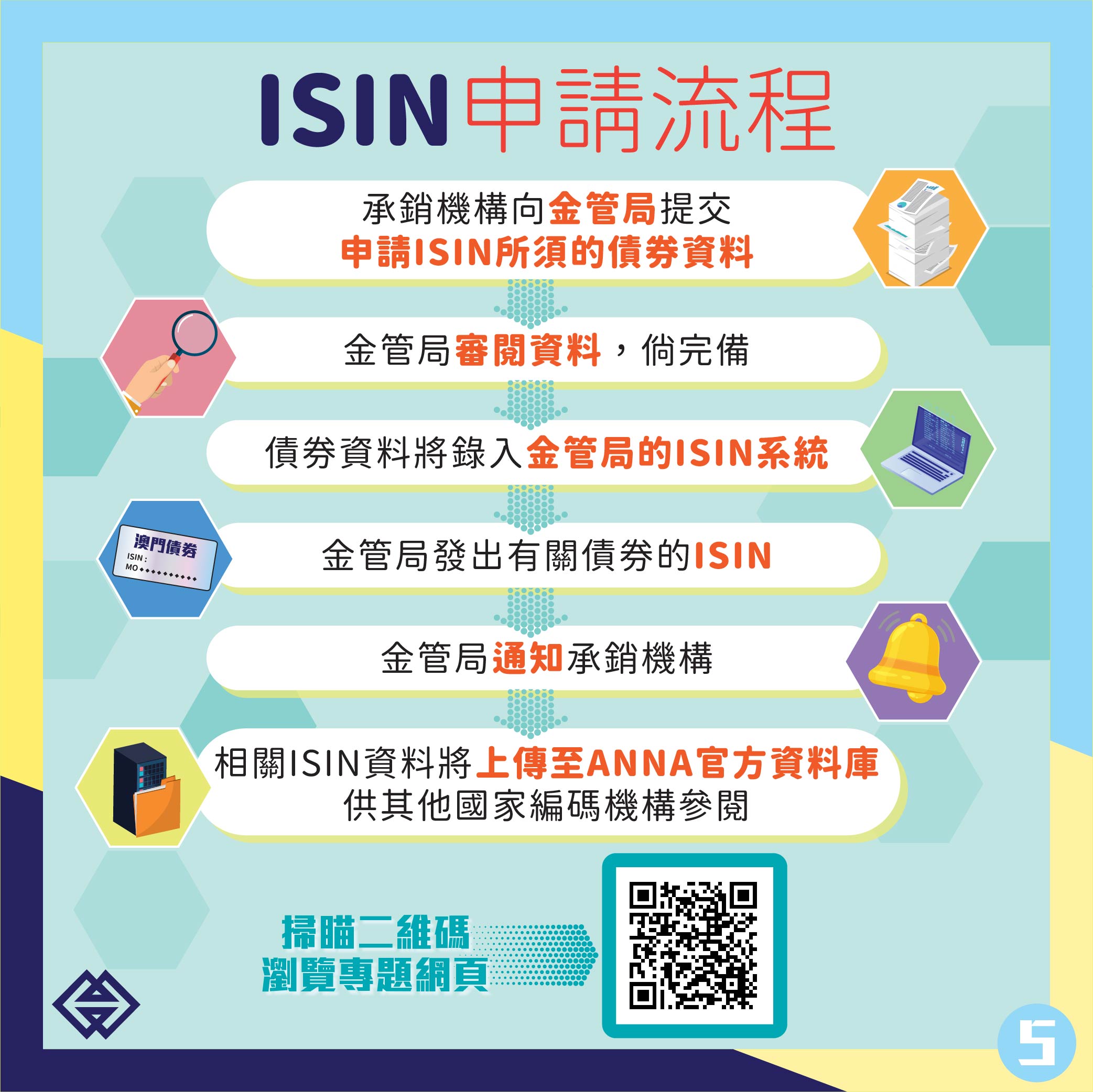 金管局已於網頁開設ISIN專區( https://www.amcm.gov.mo/zh/news-and-announcements/isin ),方便公眾查閱瞭解詳情。未來,金管局將繼續優化軟硬基建,為澳門債券市場營造更好的發展條件,促進澳門現代金融業發展,助力澳門經濟適度多元。
