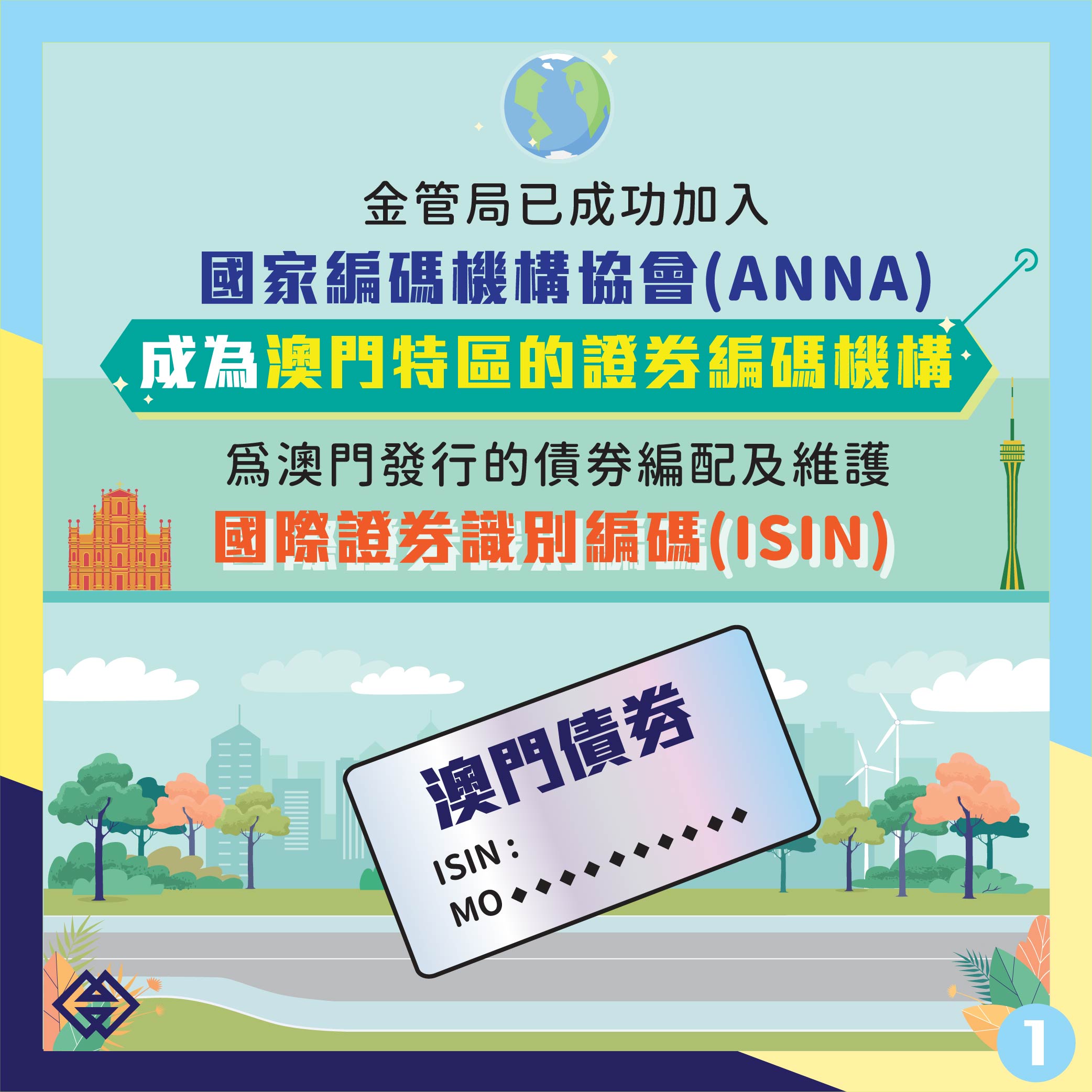 為配合澳門債券市場發展,便利在澳門發行的債券獲取國際證券識別碼(International Securities Identification Number, ISIN),金管局已加入國家編碼機構協會(Association of National Numbering Agencies, ANNA),並完成編碼系統對接,今(18)日起可為在澳門發行的債券編配ISIN,提高債券發行效率。