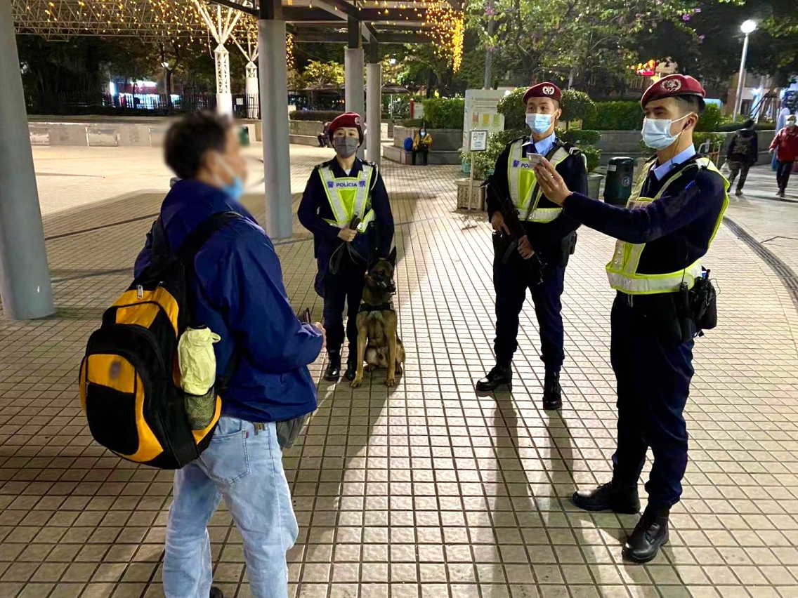 在警察總局統籌下,治安警察局持續開展「冬防行動2022」,確保本澳在歲晚及春節期間保持良好的治安環境。於1月18日至19日凌晨,治安警察局澳門警務廳、情報廳、交通廳、特警隊聯同警犬組合共派出48名人員,分別在澳門北區及路氹城金光大道一帶截查可疑人士,並巡查了澳門多間遊戲機中心、卡拉OK及酒吧,以預防及打擊各種不法行為,同時在各區進行查車行動,打擊醉駕藥駕等違法行為。