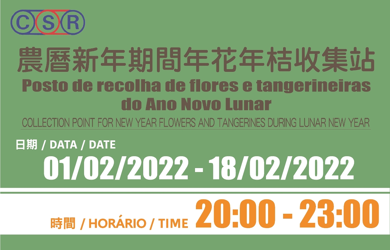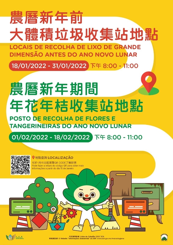農曆新年將至,為保持社區環境衛生,市政署於1月18至31日期間,在本澳各區設134個大體積垃圾收集站,方便市民棄置大掃除垃圾及大體積家具;而2月1至18日期間,大體積垃圾收集站將改為年花年桔收集站,回收市民棄用的年花年桔作綠化用途。