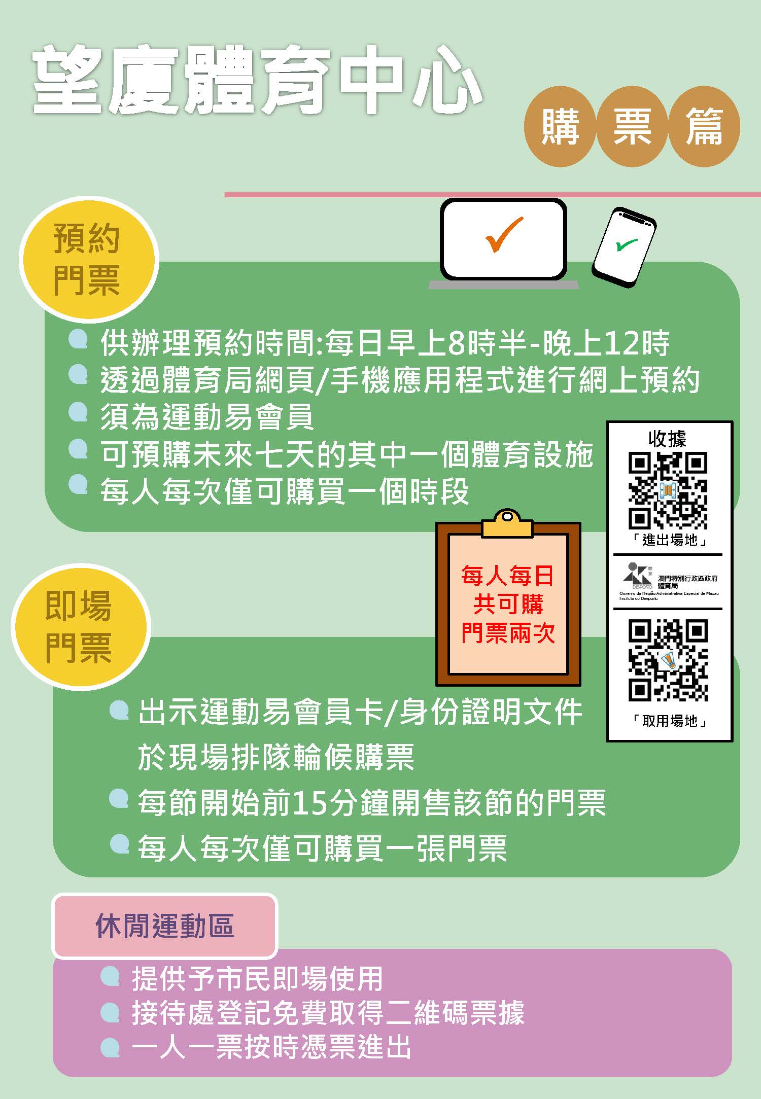 望廈體育中心樓高五層,每層設置了不同的體育設施,以受大眾歡迎的體育項目為主,為市民提供了可進行多項體育運動的鍛鍊空間,鼓勵全民運動的健康生活模式。為便利市民安排日常運動計劃,望廈體育中心的運動場地以電子化購票方式為主。另外,為配合防疫措施,望廈體育中心實施入場人數限制,以避免人群過度密集,請市民盡早預約場地。當租用者成功租用體育設施後,將獲得印有兩個二維碼的購票收據,租用者及同行使用者可憑當中「進出場地」二維碼於收據標明的使用時間開始30分鐘前進入及前往相應的樓層。然後,租用者可於收據標明的使用時間開始15分鐘前,憑收據上「取用場地」二維碼在相應的樓層親自取場,並出示收據上登記的證件供現場工作人員作核對。當租用者取用體育設施後,其同行使用者方可憑收據上的「進出場地」二維碼(複製或截圖)進出場區。