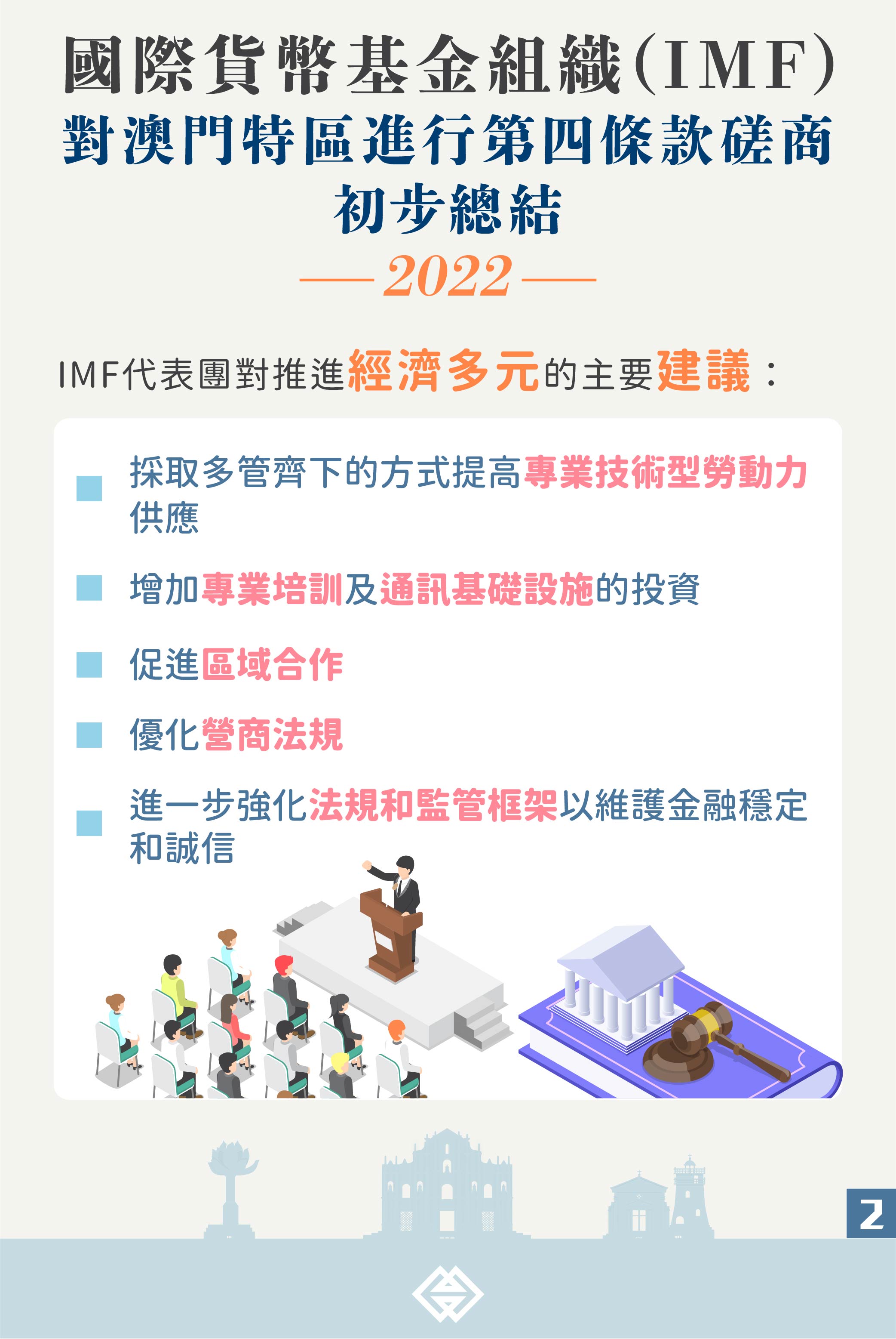在《2022年第四條款磋商代表團工作人員總結聲明》中,IMF專家認同澳門特區政府有力的疫情防控政策措施,以及運用財政資源減輕疫情對經濟造成的負面影響。同時,澳門元與港元的聯繫匯率制度繼續有利於澳門特區,支持其經濟金融穩定。