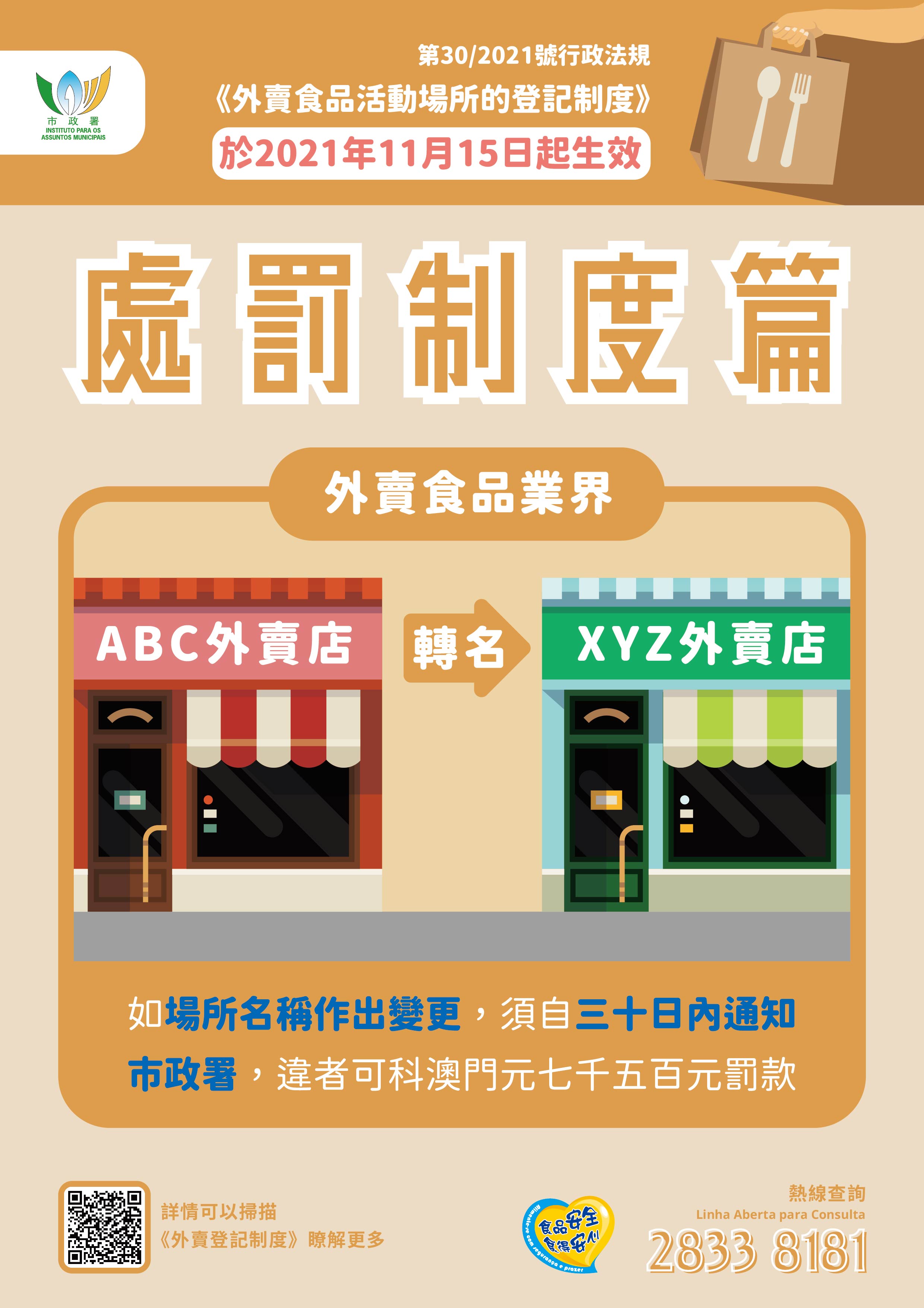 如對外賣登記制度有任何疑問,可登入市政署食安資訊網www.foodsafety.gov.mo或手機應用程式內的“外賣食品活動場所的登記制度”專頁瞭解詳情,或可致電食安專線2833 8181查詢。