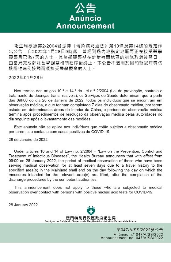 目前,針對有關地區的醫學觀察措施取消時,曾到過有關地區而正在接受醫學觀察的人士仍須繼續接受醫學觀察直至原定的醫學觀察期完結。新型冠狀病毒感染應變協調中心宣佈,因應內地的疫情變化,考慮到有關措施取消時,意味著來自有關地區的人士不再具有較高風險,經評估,衛生局根據第2/2004號法律《傳染病防治法》第10條及第14條的規定作出公告,自2022年1月28日上午9時起,曾經到過內地指定地區而正在接受醫學觀察且已滿7天的人士,其醫學觀察期在針對有關地區的措施取消後翌日,由當局完成解除醫學觀察相關程序後終止;但相關公告不適用於因和新冠病毒核酸陽性病例接觸而須接受醫學觀察的人士。