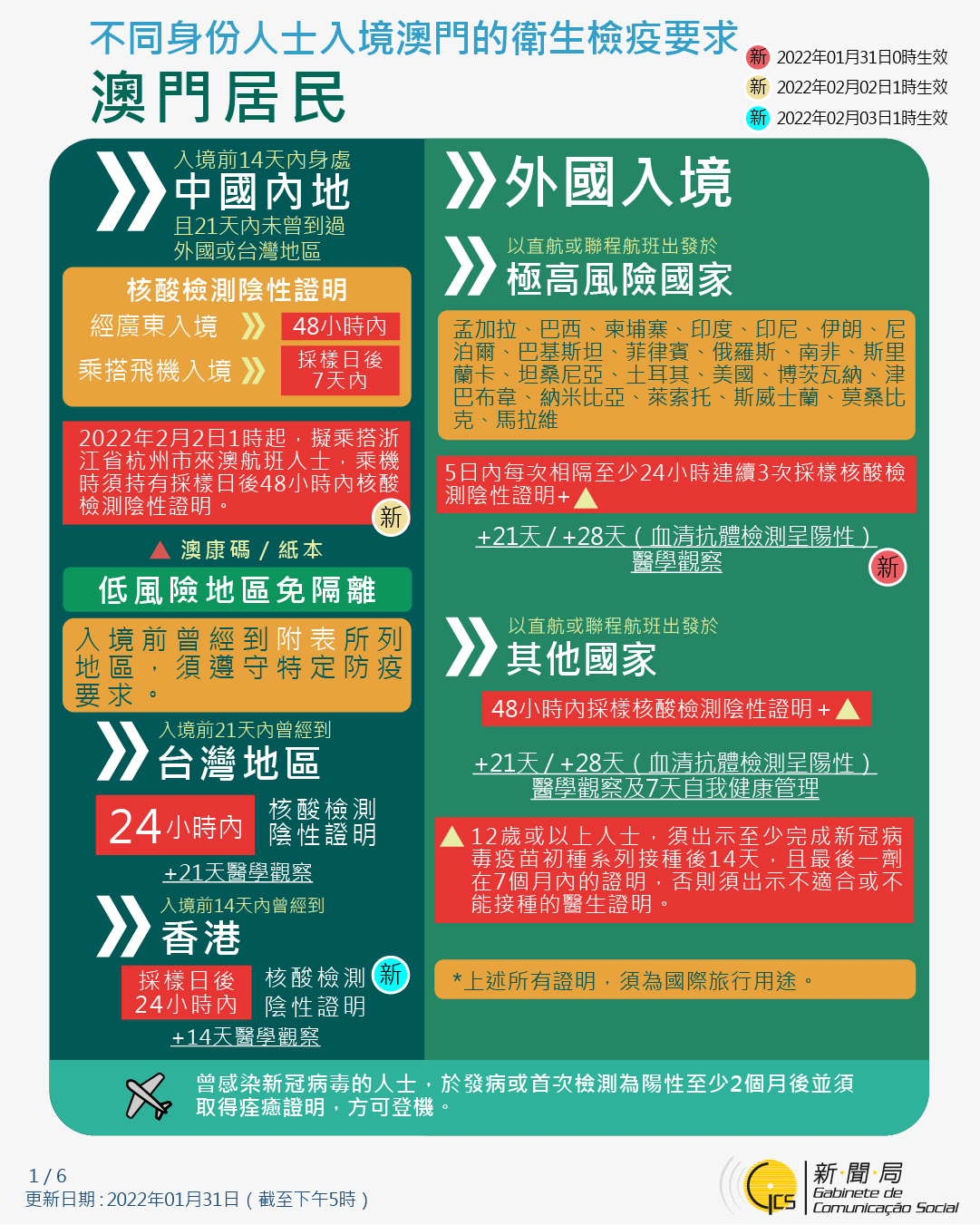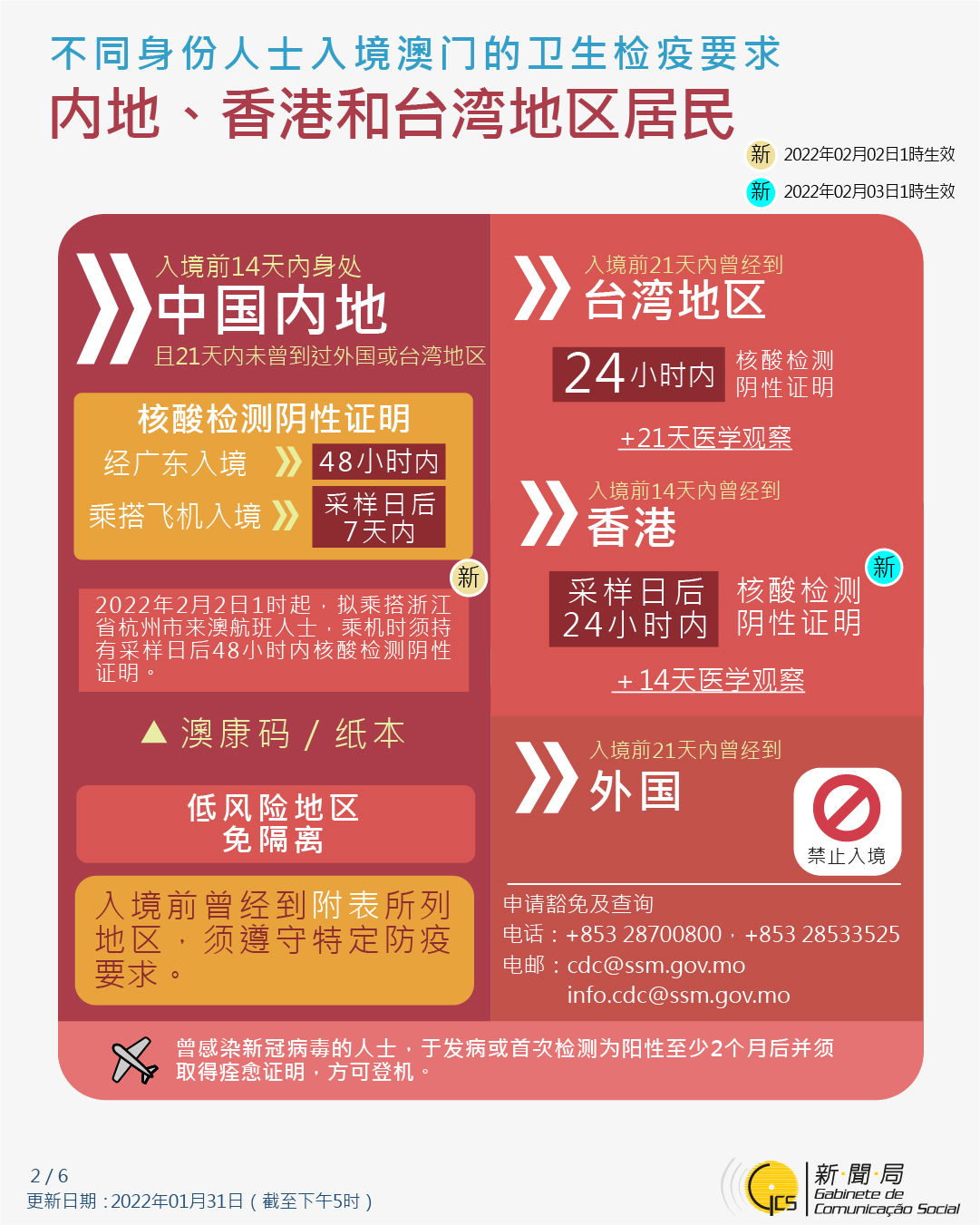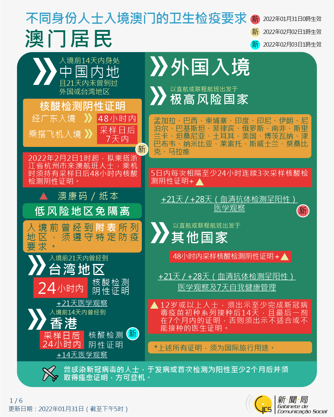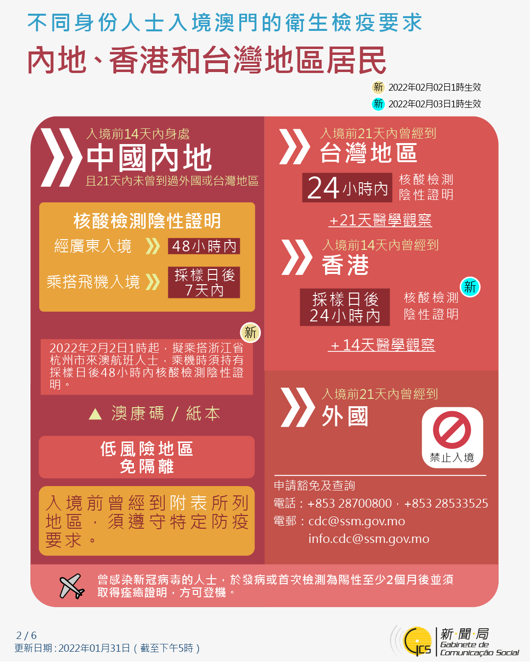 【圖文包】2022/1/31最新入境澳門衛生檢疫要求