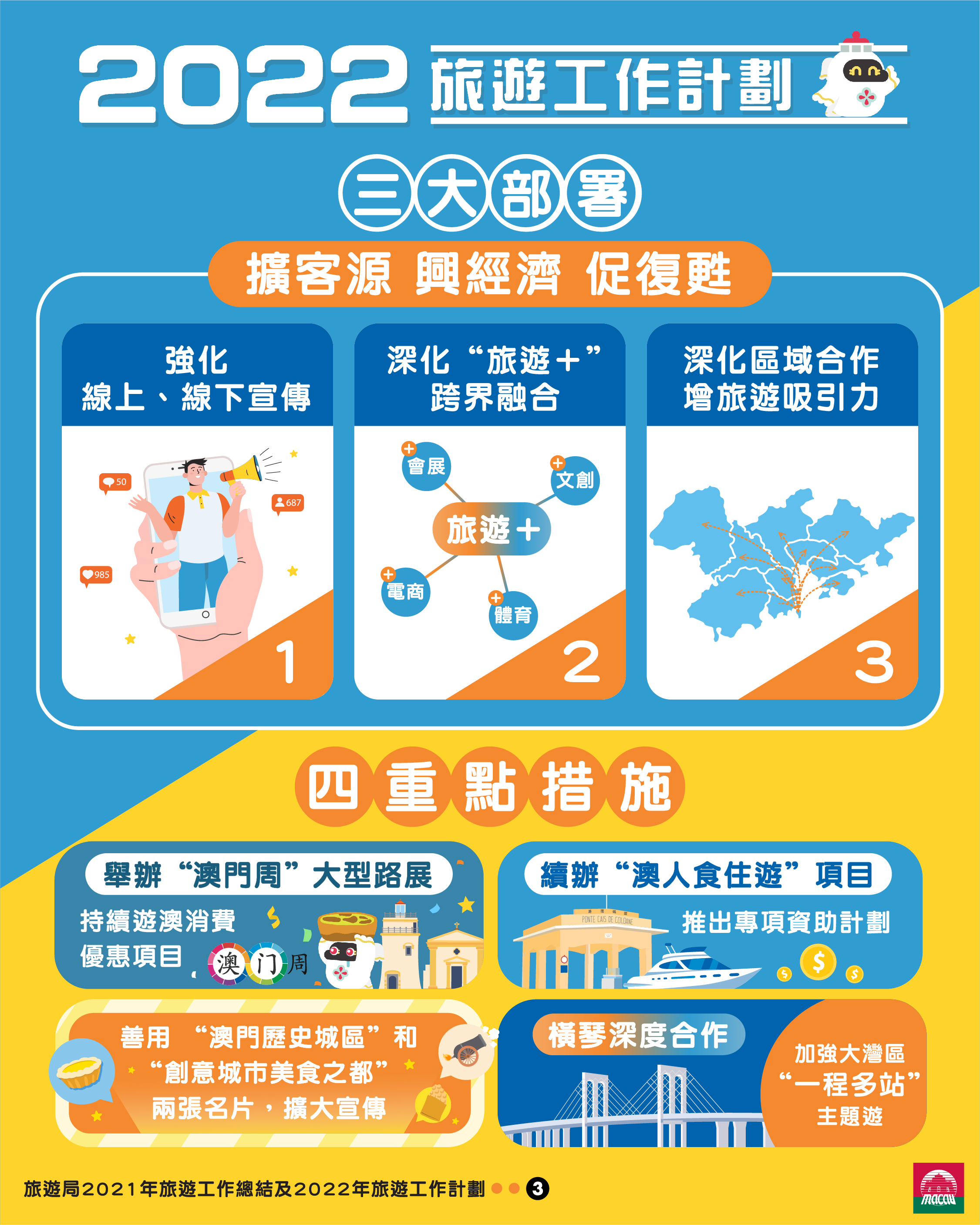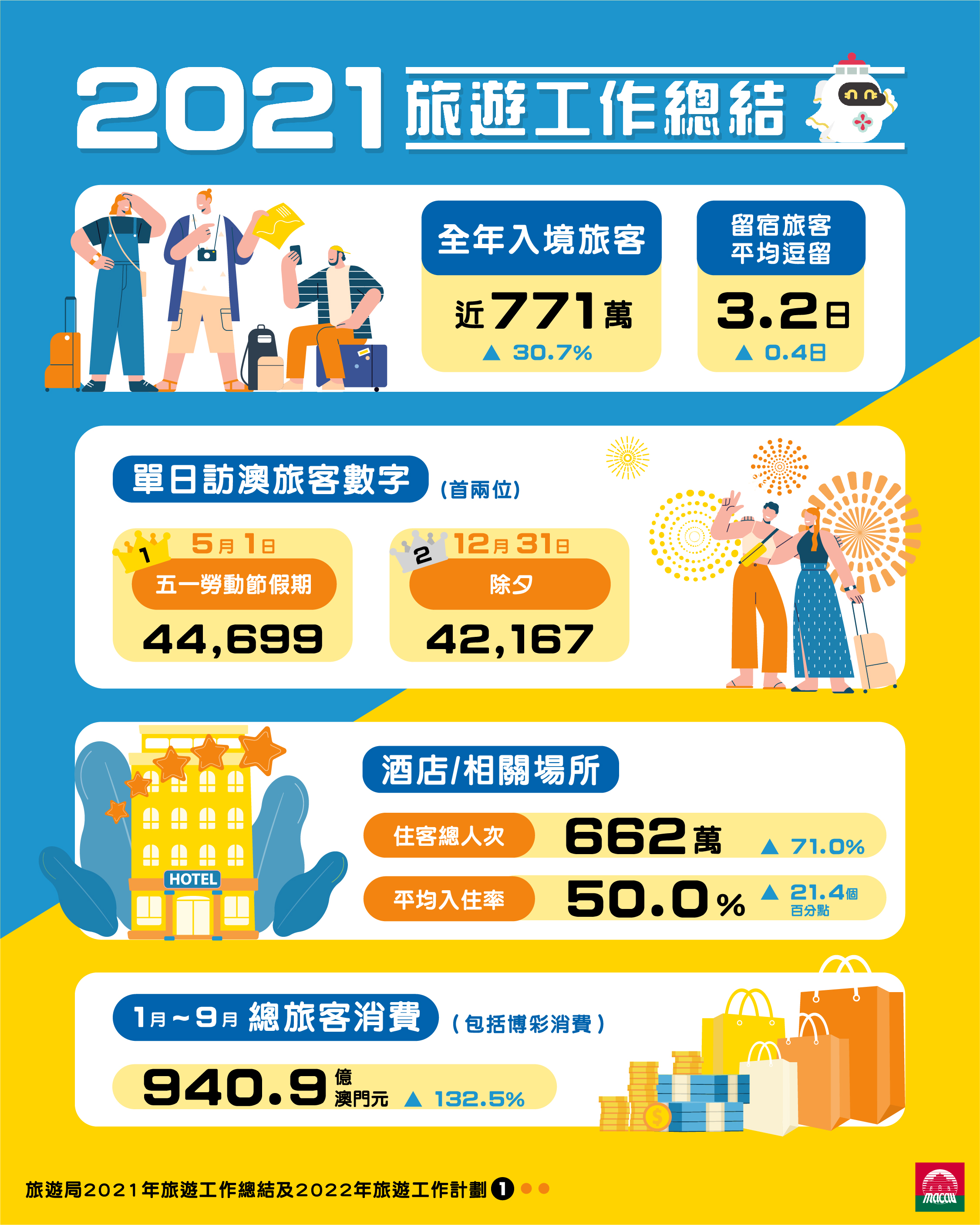 有關旅遊局2021年工作回顧及2022年重點工作,請參考上載於澳門旅遊業界網站的“旅遊局年度工作簡報”,連結:https://industry.macaotourism.gov.mo/file/pdf/2022_Annual_Report.pdf。