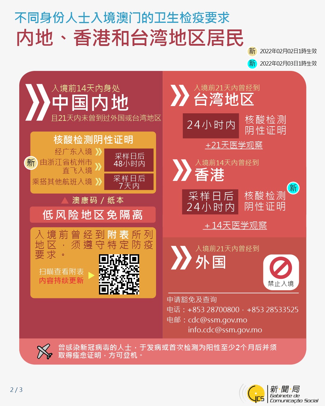 【圖文包】2022/2/1最新入境澳門衛生檢疫要求