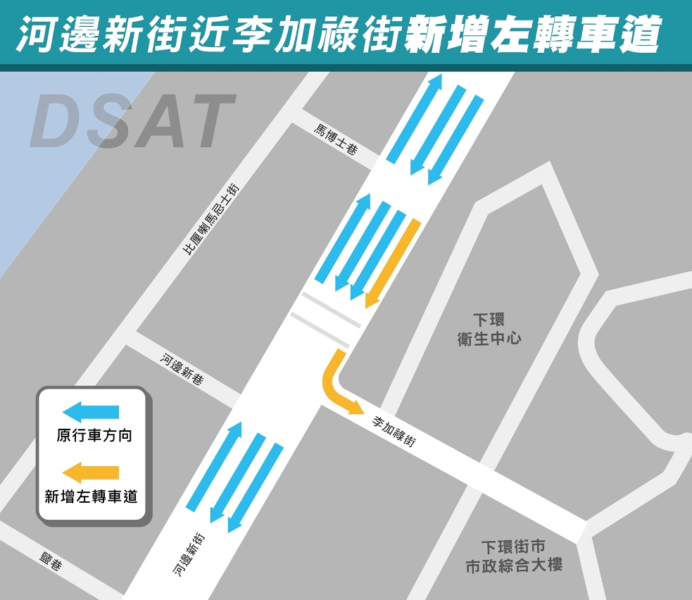 為更充分利用河邊新街的行車空間,交通事務局近期調整並重新分配河邊新街近李加祿街一段的行車道為四線雙向車道,其中往司打口方向維持一線行車,向媽閣方向維持兩線直行,並增加一條左轉入李加祿街的專屬車道。