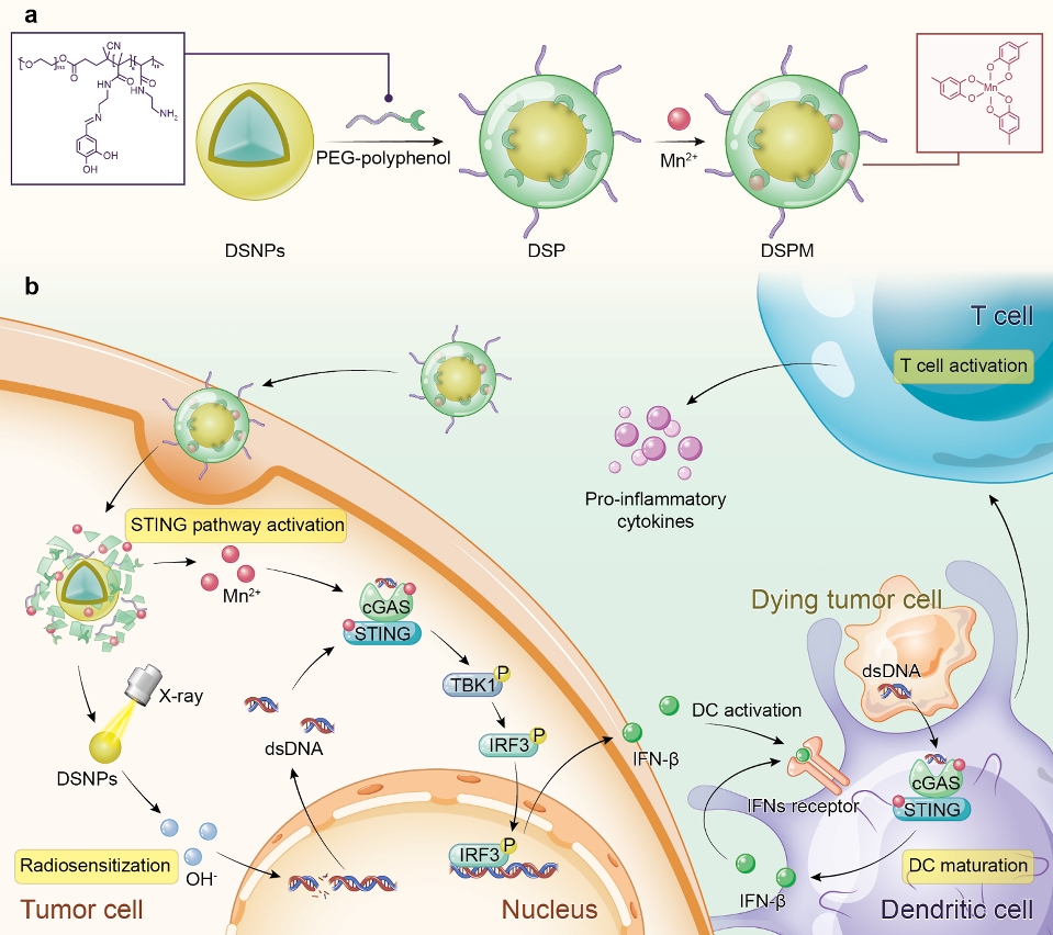 近年來,免疫療法的興起改變了癌症治療的模式,然而腫瘤微環境中淋巴細胞浸潤不夠,促使腫瘤變“冷”,導致免疫療法的療效不高。最新研究結果表示,干擾素基因刺激因子(stimulator of interferon genes,STING)通路的激活能啟動抗腫瘤天然免疫應答,使“冷”腫瘤轉化為“熱”腫瘤,從而提高腫瘤患者對免疫療法的療效。傳統的放射治療能誘導胞質dsDNA的形成,進而激活STING通路;此外,單獨的錳離子也可作為STING通路的激活因子,因此,團隊利用化學合成的多酚衍生物與多種金屬離子配位,構建新型金屬—多酚網絡DSPM,以激活腫瘤微環境STING通路,助力腫瘤放射治療。