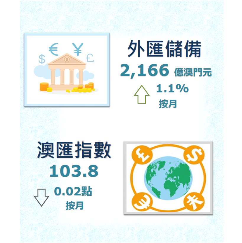 2022年1月的貿易加權澳匯指數為103.8,較上月下跌0.02點,與去年同期比較則上升1.88點,顯示總體來說,澳門元兌澳門主要貿易夥伴的貨幣匯率按月下浮,而按年則出現上浮的情況。