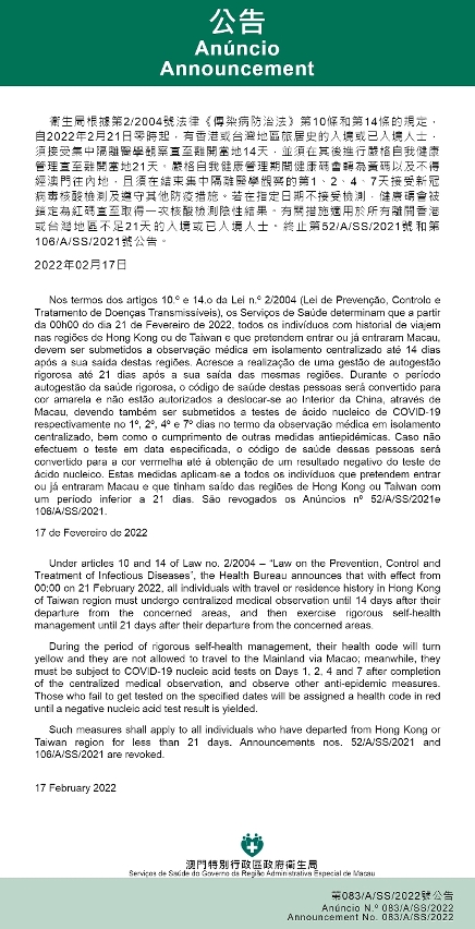 新型冠狀病毒感染應變協調中心(以下簡稱應變協調中心)宣佈,因應香港和台灣地區的疫情變化,衛生局根據第2/2004號法律《傳染病防治法》第10條和第14條的規定作出公告,自2022年2月21日零時起,有香港或台灣地區旅居史的入境或已入境人士,須接受集中隔離醫學觀察直至離開當地14天,並須在其後進行嚴格自我健康管理直至離開當地21天。嚴格自我健康管理期間健康碼會轉為黃碼以及不得經澳門往內地,且須在結束集中隔離醫學觀察的第1、2、4、7天接受新冠病毒核酸檢測及遵守其他防疫措施。若在指定日期不接受檢測,健康碼會被鎖定為紅碼直至取得1次核酸檢測陰性結果。有關措施適用於所有離開香港或台灣地區不足21天的入境或已入境人士。終止第52/A/SS/2021號和第106/A/SS/2021號公告。