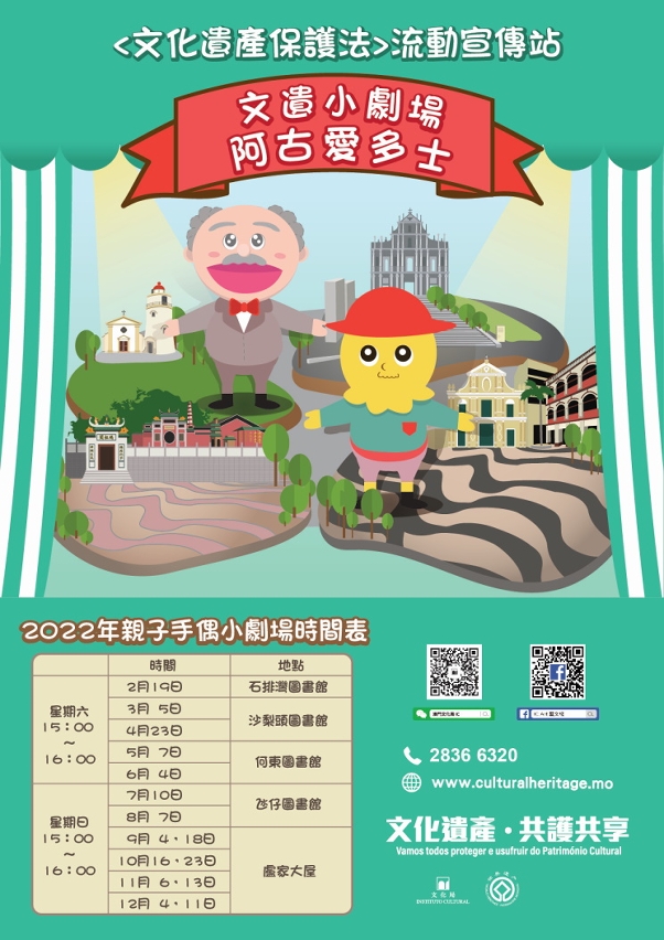 今年親子手偶小劇場將會以新劇本上演,以更活潑和生活化的方式,傳遞正確文遺保護資訊,現場更設有獎小遊戲。親子手偶小劇場將於指定時間(具體時間可參閱下列表格)在氹仔圖書館、沙梨頭圖書館、何東圖書館、石排灣圖書館和盧家大屋上演。
