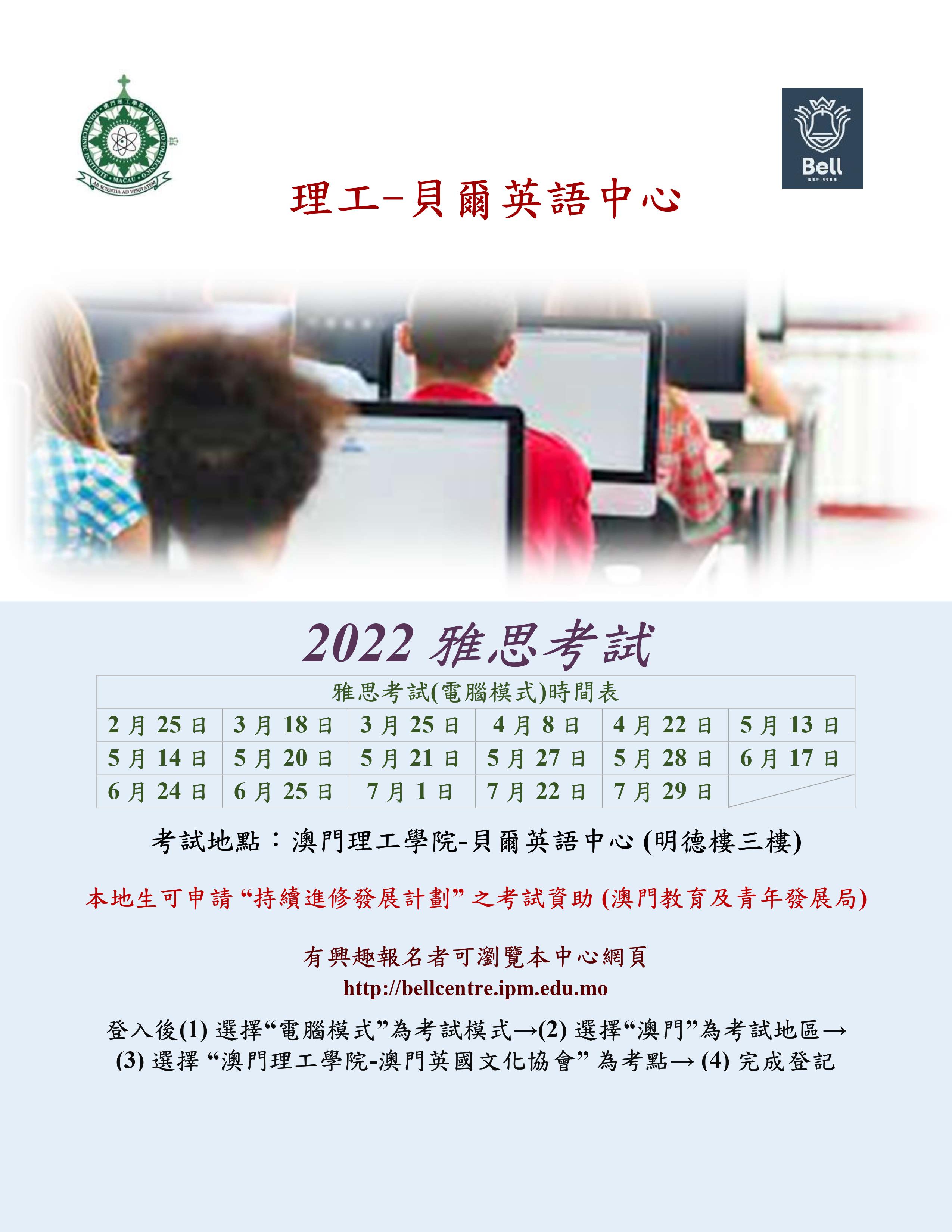 澳門理工學院-貝爾英語中心持續為澳門各中小學、社會各界及大中華地區提供優質的英語大學課程及職業技術教育的機構,服務內容包括英語課程、專業英語教材開發、語言評估及測試和教師培訓等。多年來亦堅持使用先進的教學方法、度身編選的教材以及完善的多媒體技術幫助大眾提升英語水平,提供多元化之英語培訓課程及語言水平測試,致力協助特區政府打造澳門為國際英語語言測試及培訓基地。更多詳情,請瀏覽澳門理工學院-貝爾英語中心網站: http://bellcentre.ipm.edu.mo,查詢電話: 8599 3162。