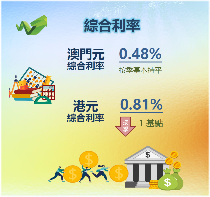 截至2021年12月底,澳門元綜合利率按季大致持平於0.48%,而港元綜合利率則從2021年9月底的0.82%,微跌1基點至0.81%。