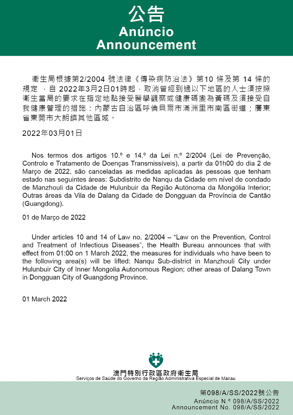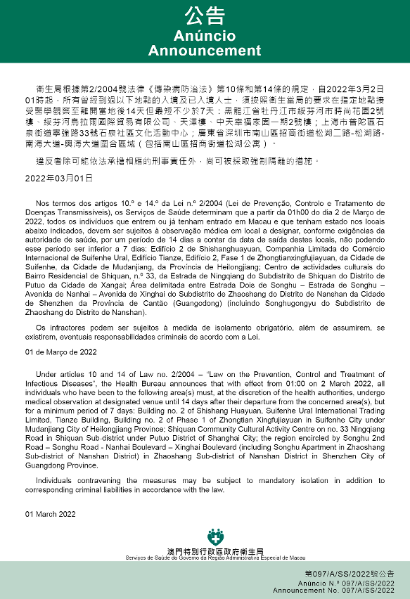 新型冠狀病毒感染應變協調中心(下稱應變協調中心)宣佈,因應內地的疫情變化,衛生局根據第2/2004號法律《傳染病防治法》第10條和第14條的規定,自2022年3月2日凌晨1時起,所有曾經到過以下地點的入境及已入境人士,須按照衛生當局的要求在指定地點接受醫學觀察至離開當地後14天但最短不少於7天:黑龍江省牡丹江市綏芬河市時尚花園2號樓、綏芬河烏拉爾國際貿易有限公司、天澤樓、中天幸福家園一期2號樓;上海市普陀區石泉街道寧強路33號石泉社區文化活動中心;廣東省深圳市南山區招商街道松湖二路-松湖路-南海大道-興海大道圍合區域(包括南山區招商街道松湖公寓)。