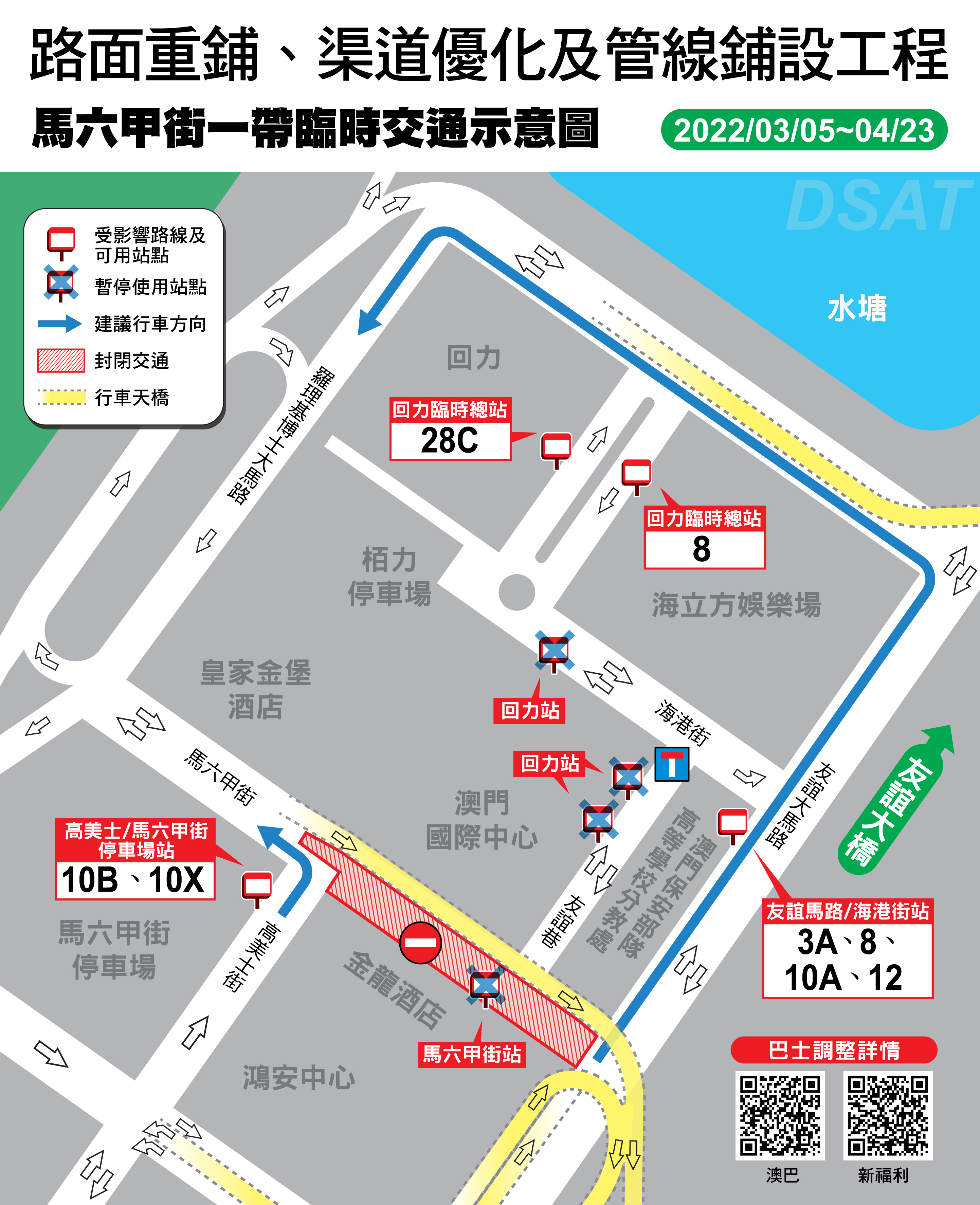 巴士方面,3月5日(周六)首班車起至4月23日(周六),“馬六甲街”及“回力”巴士站暫停使用,水塘巷設立臨時巴士總站。3A、8、10A、10B、10X、12及28C路線巴士需改道行駛及臨時停靠其他站點,而56路線則改道行駛但停靠站點不變。詳情可查閱澳巴網頁http://www.tcm.com.mo/web/NewsVB/data/782_cn.pdf 及新福利網頁https://www.transmac.com.mo/route-change/tr-047-2022/。