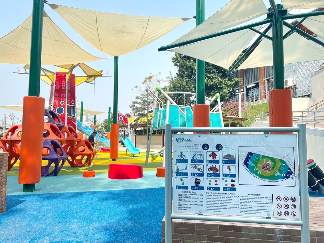 松山市政公園綜合廣場設施已使用多年並出現殘舊及老化,市政署於去年開展綜合廣場之整體優化工程,早前廣場部分經優化完善設施後已開放使用,近日兒童遊樂場亦完成重整,包括更換兒童遊樂設施,設置多座形式多樣以攀爬為主具挑戰性的遊樂設施,主要適合五至十二歲兒童遊玩,以滿足各年齡段的兒童需求。此外,優化工程亦翻新並增加了場內遮陽設施、更換節能照明系統、飲用水機等;同時亦優化了周邊的綠化景觀,包括種植了多種開花植物,如木春菊、長壽花及蔥蘭等。