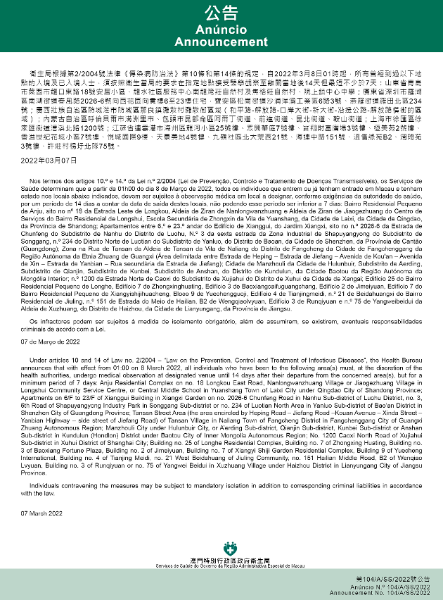 新型冠狀病毒感染應變協調中心(下稱應變協調中心)宣佈,因應內地的疫情變化,衛生局根據第2/2004號法律《傳染病防治法》第10條和第14條的規定,自2022年3月8日凌晨1時起,所有曾經到過以下地點的入境及已入境人士,須按照衛生當局的要求在指定地點接受醫學觀察至離開當地後14天但最短不少於7天:山東省青島市萊西市龍口東路18號安居小區、龍水社區服務中心南龍灣莊自然村及焦格莊自然村、院上鎮中心中學;廣東省深圳市羅湖區南湖街道春風路2026-6號向西花園向貴樓6至23樓住宅,寶安區松崗街道沙浦洋湧工業區6路3號、燕羅街道羅田北區234號;廣西壯族自治區防城港市防城區那良鎮灘散村灘散街區域(和平路-解放路-口岸大街-新大街-沿邊公路-解放路橫街的區域);內蒙古自治區呼倫貝爾市滿洲里市、包頭市昆都侖區阿爾丁街道、前進街道、昆北街道、鞍山街道;上海市徐匯區徐家匯街道漕溪北路1200號;江蘇省連雲港市海州區龍河小區25號樓、眾興華庭7號樓、寶翔財富廣場3號樓、極美苑2號樓、香溢世紀花城小區7號樓、悅城國際9棟、天景美地4號樓、九嶺社區北大荒西21號、海連中路151號、溫僑綠苑B2、潤琦苑3號樓、許莊村楊圩北隊75號。