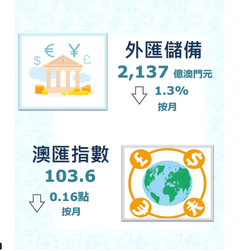 2022年2月的貿易加權澳匯指數為103.6,較上月下跌0.16點,與去年同期比較則上升1.47點,顯示總體來說,澳門元兌澳門主要貿易夥伴的貨幣匯率按月下浮,而按年則出現上浮的情況。