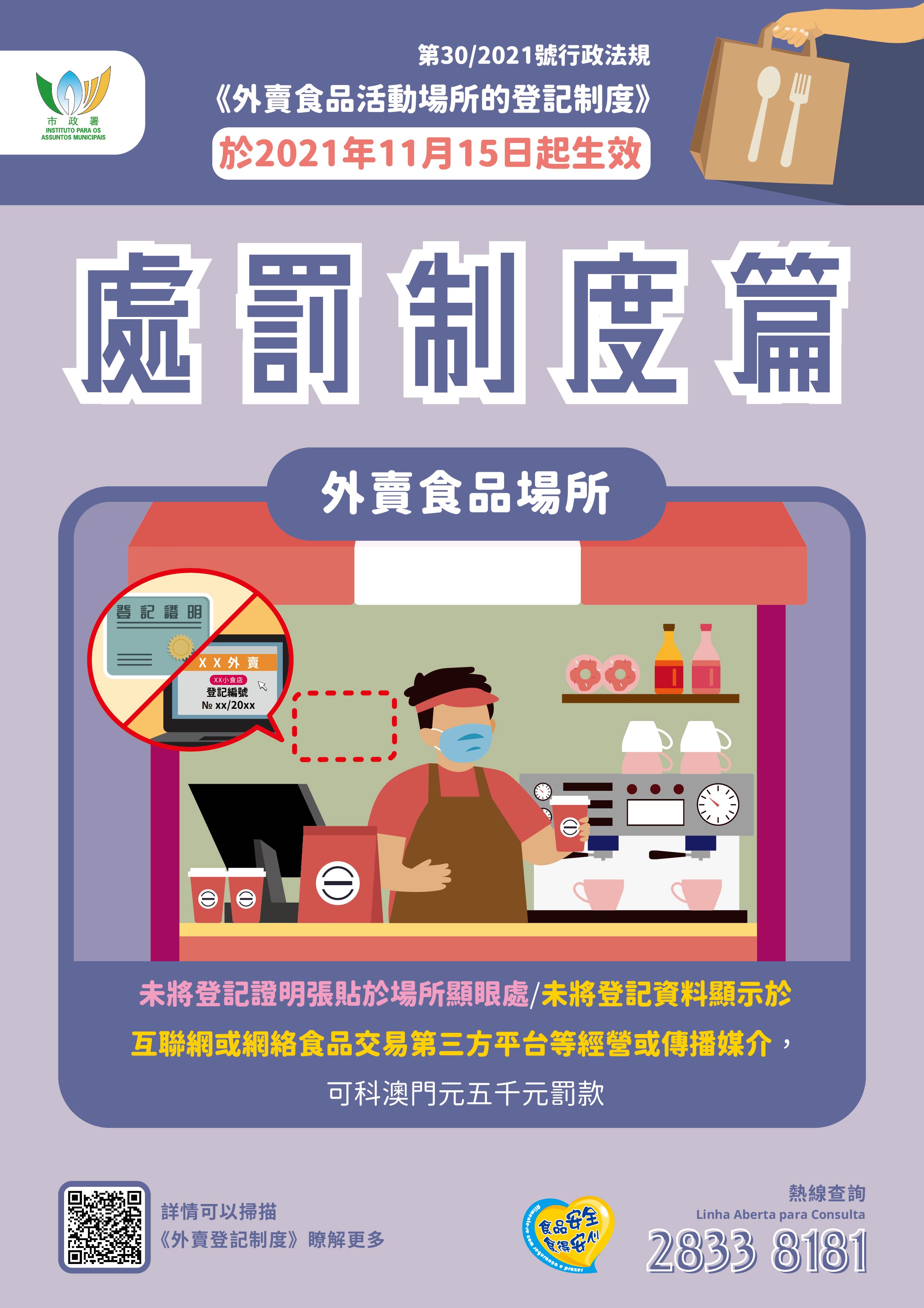 第30/2021號行政法規《外賣食品活動場所的登記制度》已於2021年11月15日生效,違反登記制度的相關規定,可被科處五千至三萬五千澳門元罰款。不論外賣店或是網絡食品交易第三方平台負責人,須瞭解登記制度的有關要求,守法經營。